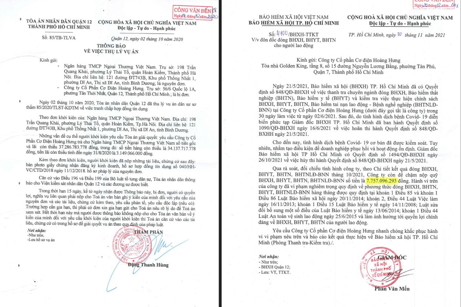 Công ty Hoàng Hưng gửi kèm các tài liệu chứng cứ liên quan theo quy định của Luật Phá sản 2014 và ghi rõ chủ nợ, các khoản nợ... Tuy nhiên, hơn 8 tháng sau, ngày 8/12/2021, TAND TP HCM mới gửi “thông báo thụ lý bổ sung đơn yêu cầu mở thủ tục phá sản”, trong khi Khoản 1, 2, Điều 42 của Luật Phá sản nêu rõ: “Trong thời hạn 30 ngày kể từ ngày thụ lý đơn yêu cầu mở thủ tục phá sản, thẩm phán phải ra quyết định mở hoặc không mở thủ tục phá sản, trừ trường hợp quy định tại Điều 105 của luật này" (Công ty Hoàng Hưng không thuộc trường hợp này).