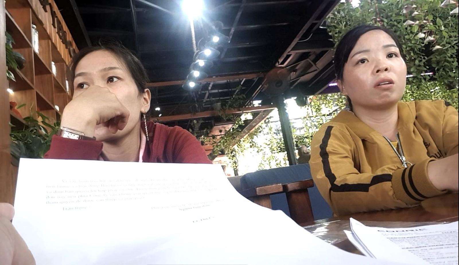 Bà Lê Thị Ly (áo đỏ) và và Lê Thị Mỹ Trang (áo vàng) là nhân viên vệ sinh công cộng tại dự án “The Light” lo lắng vì bị chây ì trả lương. Ảnh: Đình Sang