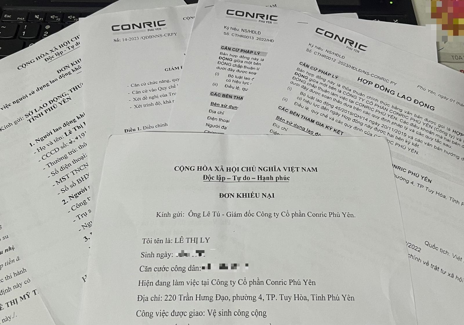 Bà Lê Thị Mỹ Trang (sinh năm 1991, trú tại thôn Mỹ Hòa, xã Hòa Thắng, huyện Phú Hòa, tỉnh Phú Yên) bức xúc: “Từ ngày 1/8/2022 đến ngày 31/7/2023, tôi và Công ty Cổ phần CONRIC Phú Yên có ký kết hợp đồng lao động (HĐLĐ) với thời hạn 12 tháng để thực hiện công việc nhân viên vệ sinh công cộng tại dự án “The Light”, địa chỉ 220 Trần Hưng Đạo với mức lương trên HĐLĐ là 4.012.000 đồng/tháng”.
