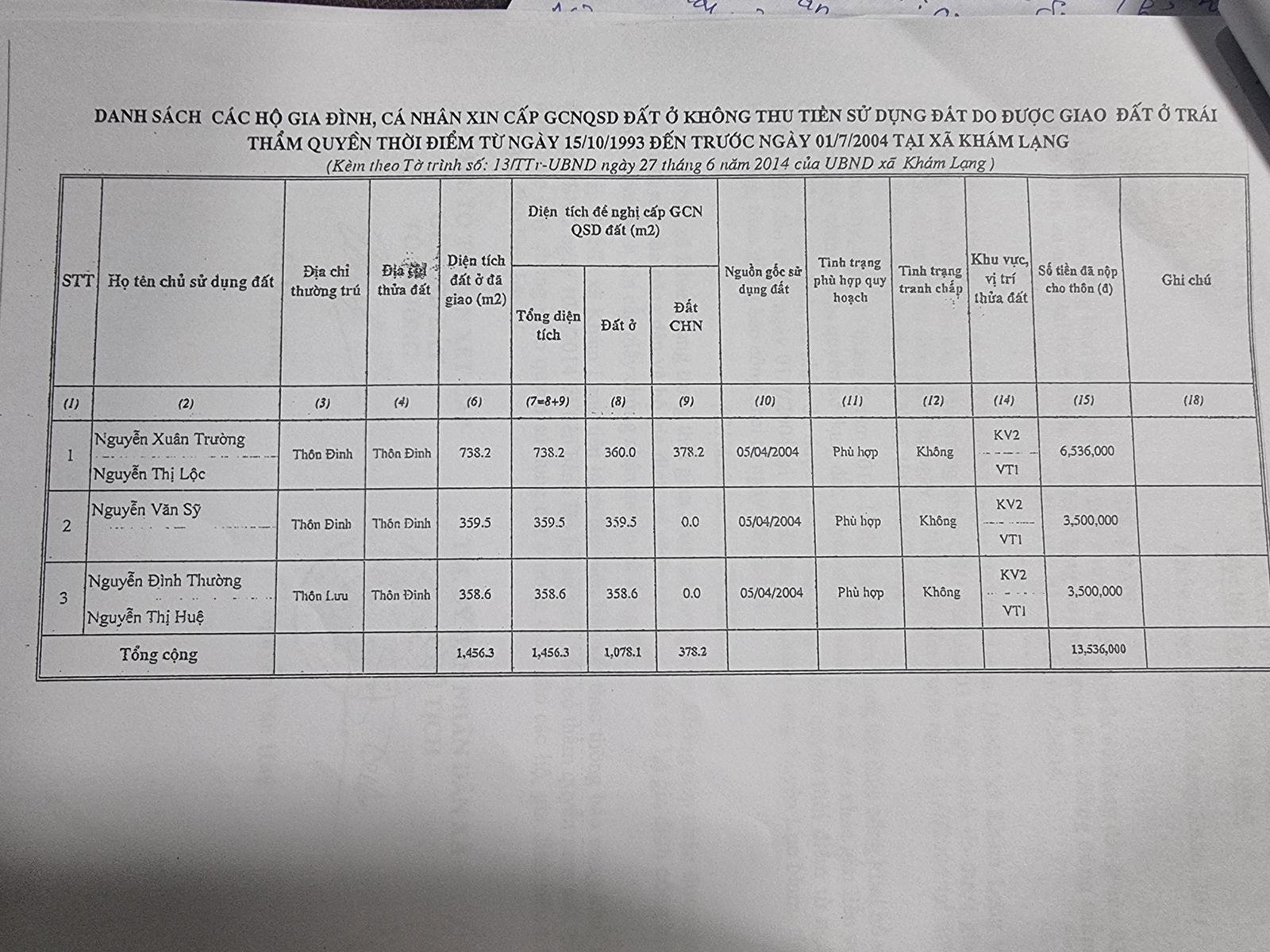 Đối với nội dung tố cáo khu Đồng Cũi mà ông Đoàn và ông Trường “nhờ” vợ chồng ông Nguyễn Văn Ninh, bà Nguyễn Thị Thoa ở thôn Đình, xã Khám Lạng đứng tên trên sổ đỏ thì theo hồ sơ Chi nhánh Văn phòng Đăng ký đất đai huyện Lục Nam cung cấp thì ngày 5/4/2004, thôn Đình có giao đất trái thẩm quyền cho hộ gia đình ông Lệ, bà Thông với diện tích 355,2 m2 và thu số tiền 3.260.000 nghìn đồng.