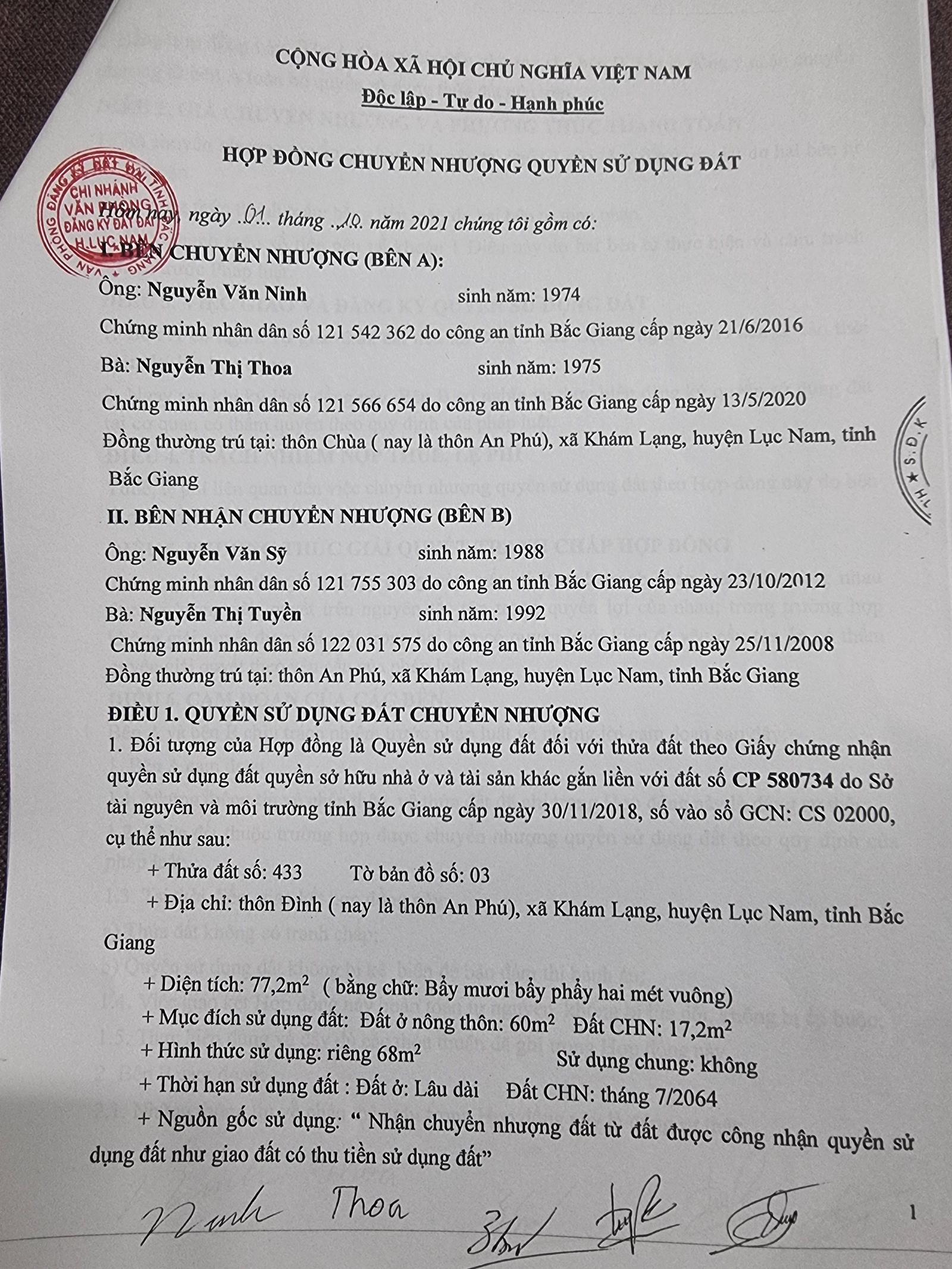 Ngày 25/10/2018, ông Lệ, bà Thông đã chuyển nhượng quyền sử dụng đất và tài sản gắn liền với đất cho vợ chồng ông Nguyễn Văn Ninh và bà Nguyễn Thị Thoa với tổng diện tích 77,2 m2, trong đó có 60,0 m2 là đất ở nông thôn và 17,2 m2 đất cây hằng năm. Đến ngày 30/11/2018 thì ông Ninh, bà Thoan được cấp giấy chứng nhận quyền sử dụng đất.
