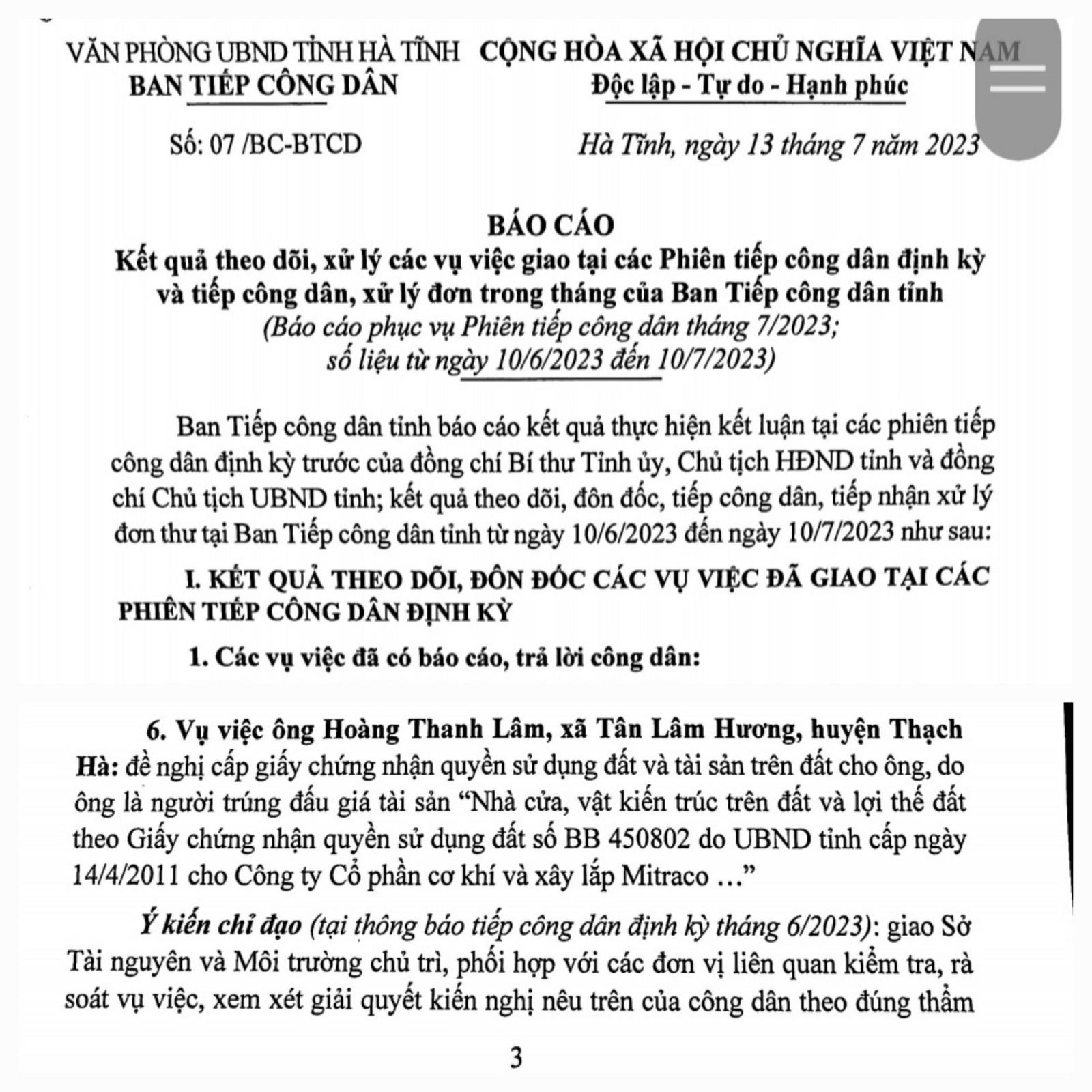 Báo Thanh tra đã có các bài viết phản ánh về vụ việc ông Hoàng Thanh Lâm ở xã Tân Lâm Hương, huyện Thạch Hà, tỉnh Hà Tĩnh tham gia trúng đấu giá tài sản của Công ty Cổ phần Cơ khí và Xây lắp Mitraco (Cty Mitraco), địa chỉ tại thị trấn Cẩm Xuyên, huyện Cẩm Xuyên, Hà Tĩnh, là thành viên của Tổng Cty Khoáng sản và Thương mại Hà Tĩnh - CTCP, với giá trị tài sản hơn 4 tỷ đồng, gồm “nhà cửa, vật kiến trúc và lợi thế trên đất” theo giấy chứng nhận quyền sử dụng đất (GCNQSDĐ) được UBND tỉnh Hà Tĩnh cấp ngày 14/4/2011 cho Cty Mitraco.
