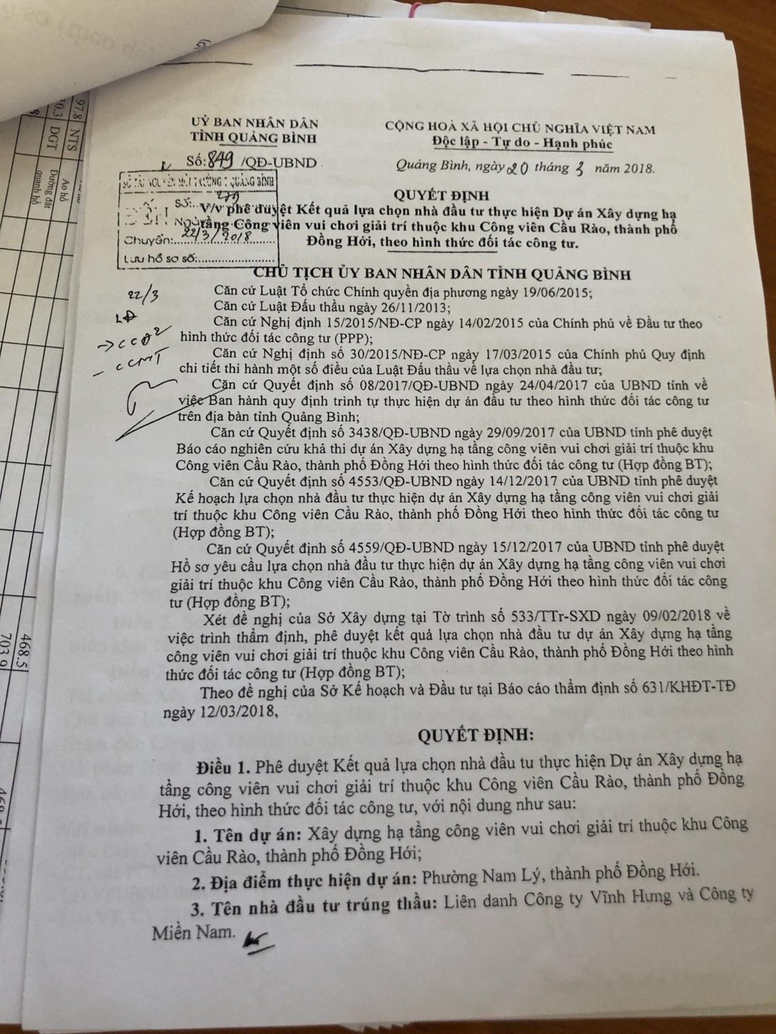 Theo Quyết định số 4553/QĐ-UBND, ngày 14/12/217 của UBND tỉnh Quảng Bình, dự án được tổ chức với hình thức chỉ định thầu chứ không phải đấu thầu kêu gọi nhà đầu tư. Đơn vị được chỉ định là Liên danh nhà đầu tư gồm: Công ty TNHH Tư vấn và Xây dựng Vĩnh Hưng và Công ty CP XNK tổng hợp Miền Nam.