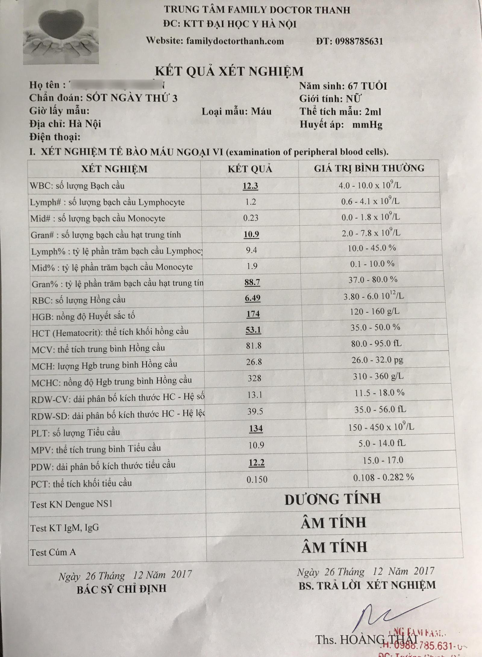 (Thanh tra) - Trung tâm Dịch vụ y tế Family Doctor Thanh (đường Trường Chinh, quận Đống Đa, Hà Nội) xét nghiệm máu ra kết quả Dengue NS1 dương tính rồi kê đơn thuốc sốt xuất huyết điều trị tại nhà. Ngay hôm sau, bệnh nhân nhập viện khẩn cấp vì nhiễm trùng máu nặng!