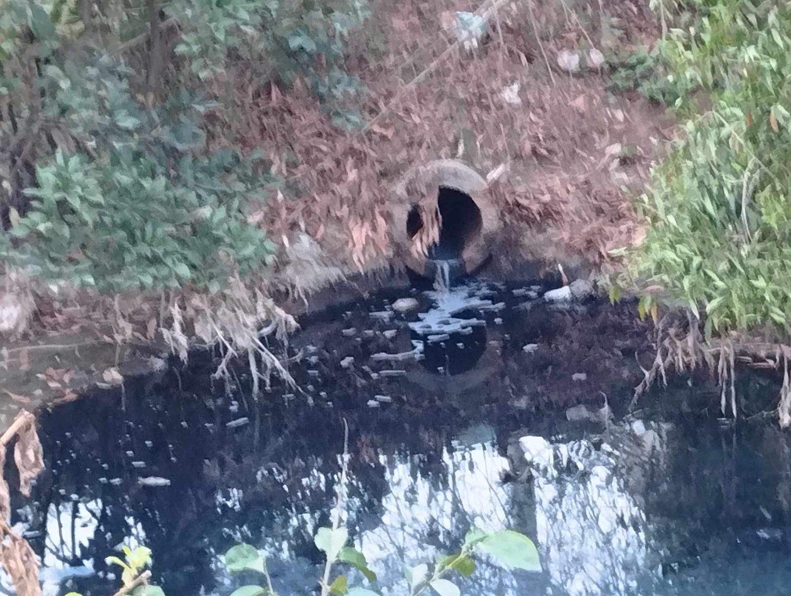 Cống nước thải có dòng nước màu xanh đen nằm gần các xưởng nhuộm