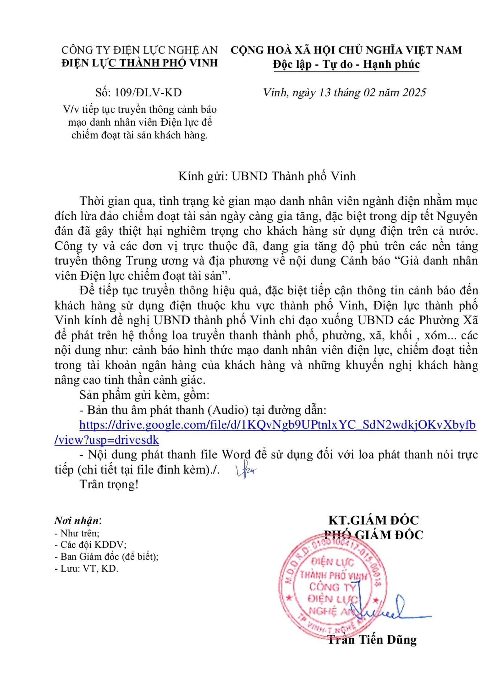 Điện lực TP Vinh cảnh báo tình trạng mạo danh nhân viên Điện lực gọi điện để lừa đảo. Ảnh: P.V