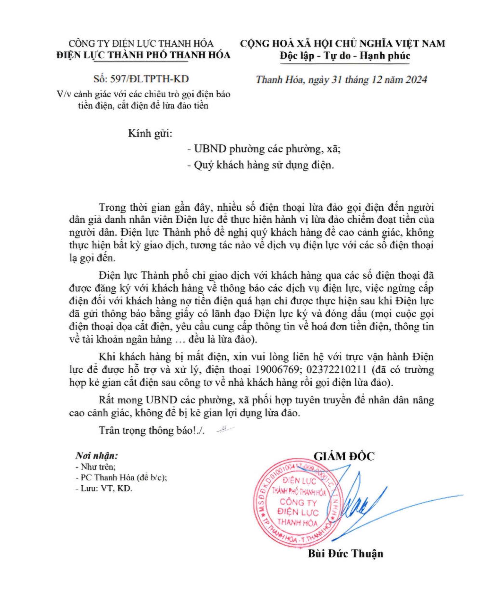 Ông Bùi Đức Thuận, Giám đốc Điện lực TP Thanh Hóa cảnh báo: Trong thời gian gần đây, nhiều số điện thoại lừa đảo gọi điện đến người dân giả danh nhân viên điện lực để thực hiện hành vị lừa đảo chiếm đoạt tiền của người dân. Điện lực TP Thanh Hóa đã có văn bản gửi đến các phường, xã trên địa bàn đề nghị quý khách hàng đề cao cảnh giác, không thực hiện bất kỳ giao dịch, tương tác nào về dịch vụ điện lực với các số điện thoại lạ gọi đến.