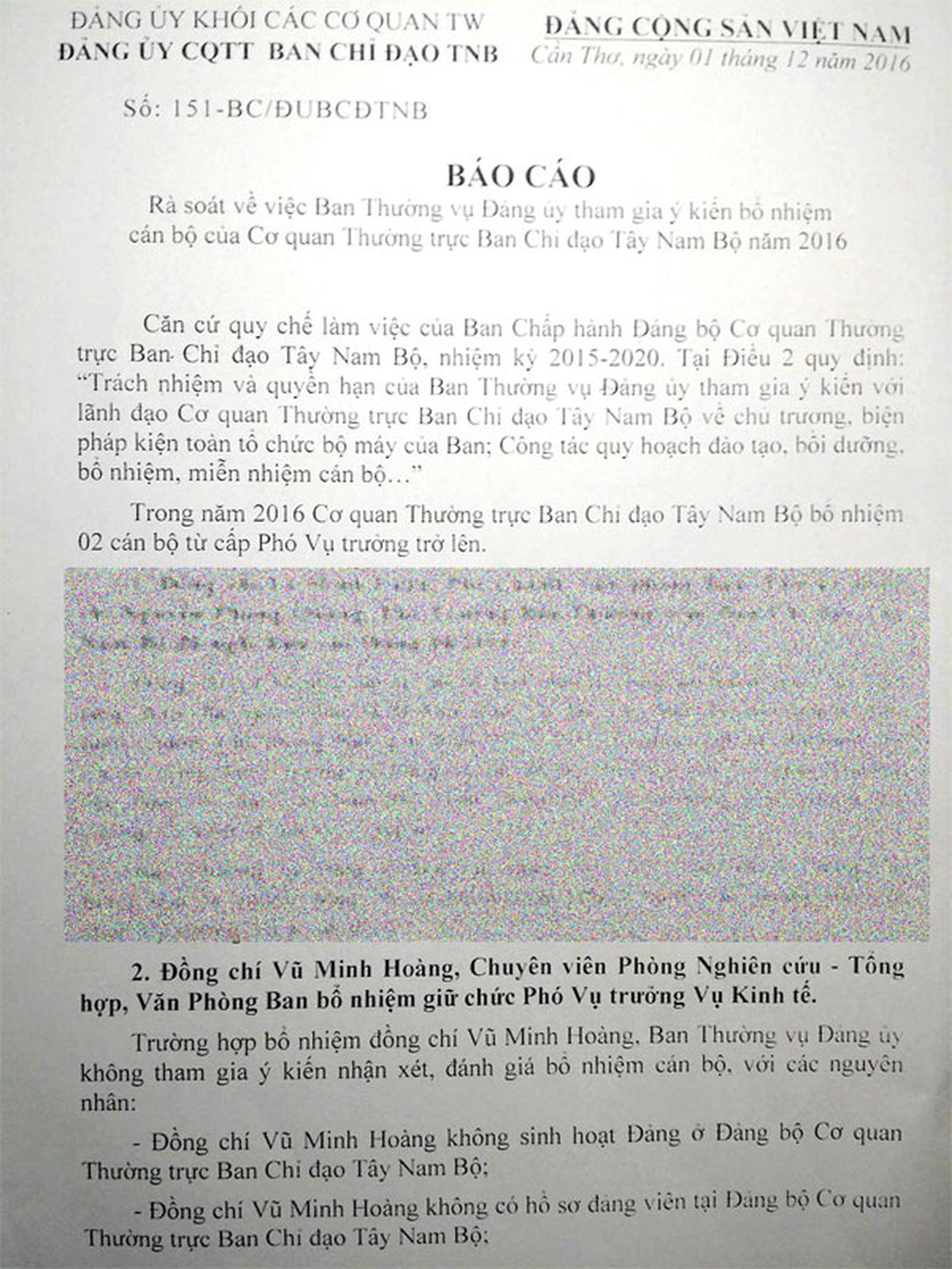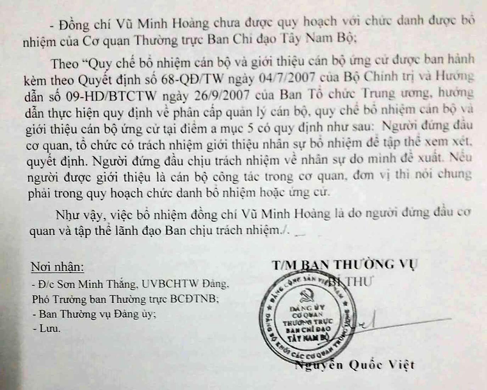 Văn bản này thể hiện việc bổ nhiệm ông Vũ Minh Hoàng không được thực hiện theo quy trình, quy định.