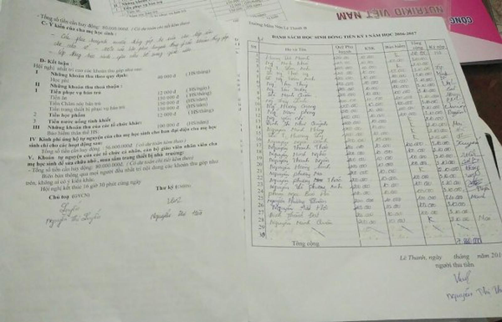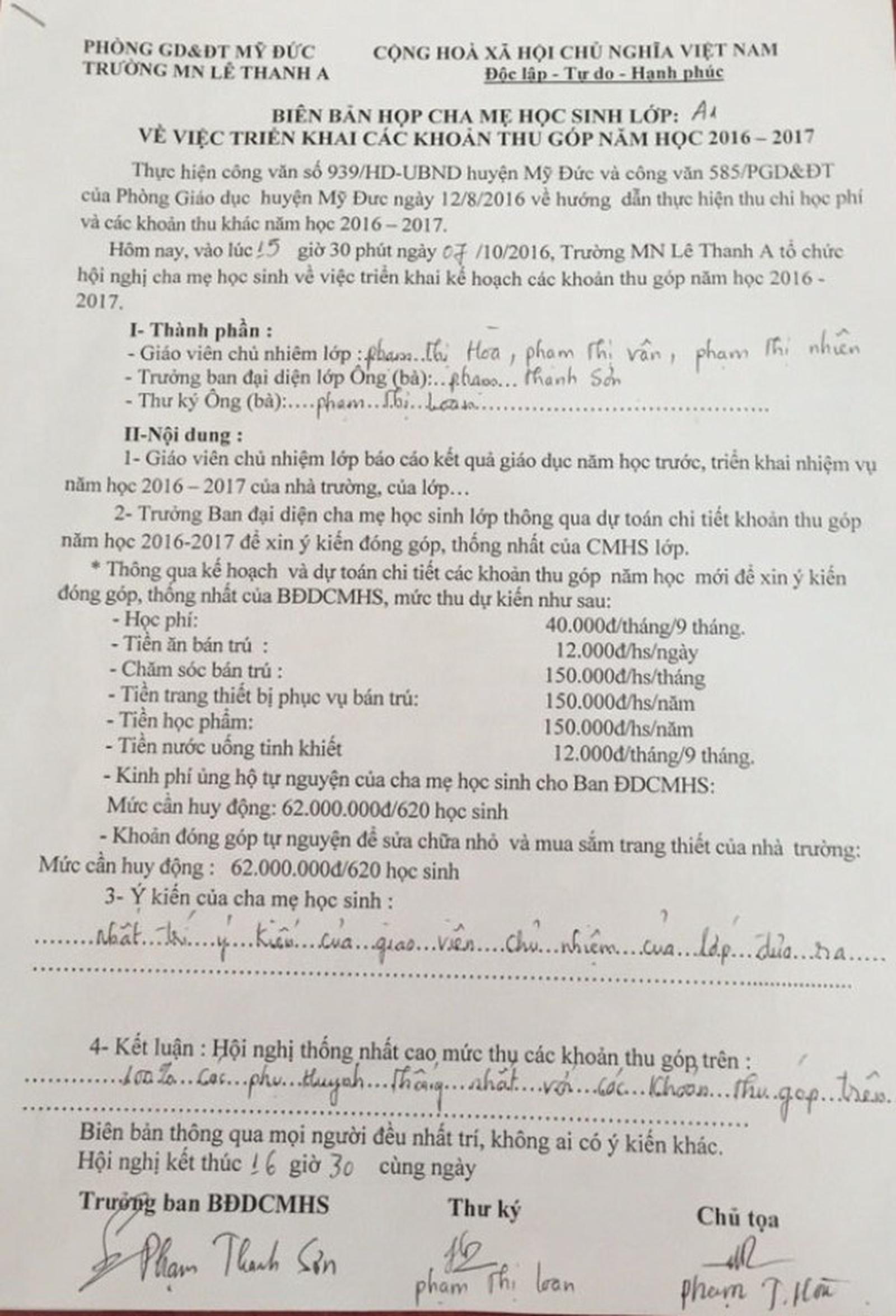 Quay lại với phản ánh trong đơn về Trường Mầm non Lê Thanh A và Lê Thanh B (Mỹ Đức, Hà Nội). Trong năm học 2016 - 2017, nhà trường đã tổ chức thu hai loại quỹ là quỹ phụ huynh và quỹ hỗ trợ giáo dục với tổng số tiền là 200.000 đồng trên một học sinh. Như vậy, với số lượng 620 học sinh đang theo học thì Trường Mầm non Lê Thanh A đã thu về 124 triệu đồng được biến tướng dưới hình thức tự nguyện. Tương tự Trường Mầm non Lê Thanh B với tổng số học sinh là 283 mỗi học sinh được đóng góp tự nguyện giống nhau là 200.000 những khoản thu vô lý này được ủng hộ lớp mua đệm, đầu quay, ti vi, điều hòa.