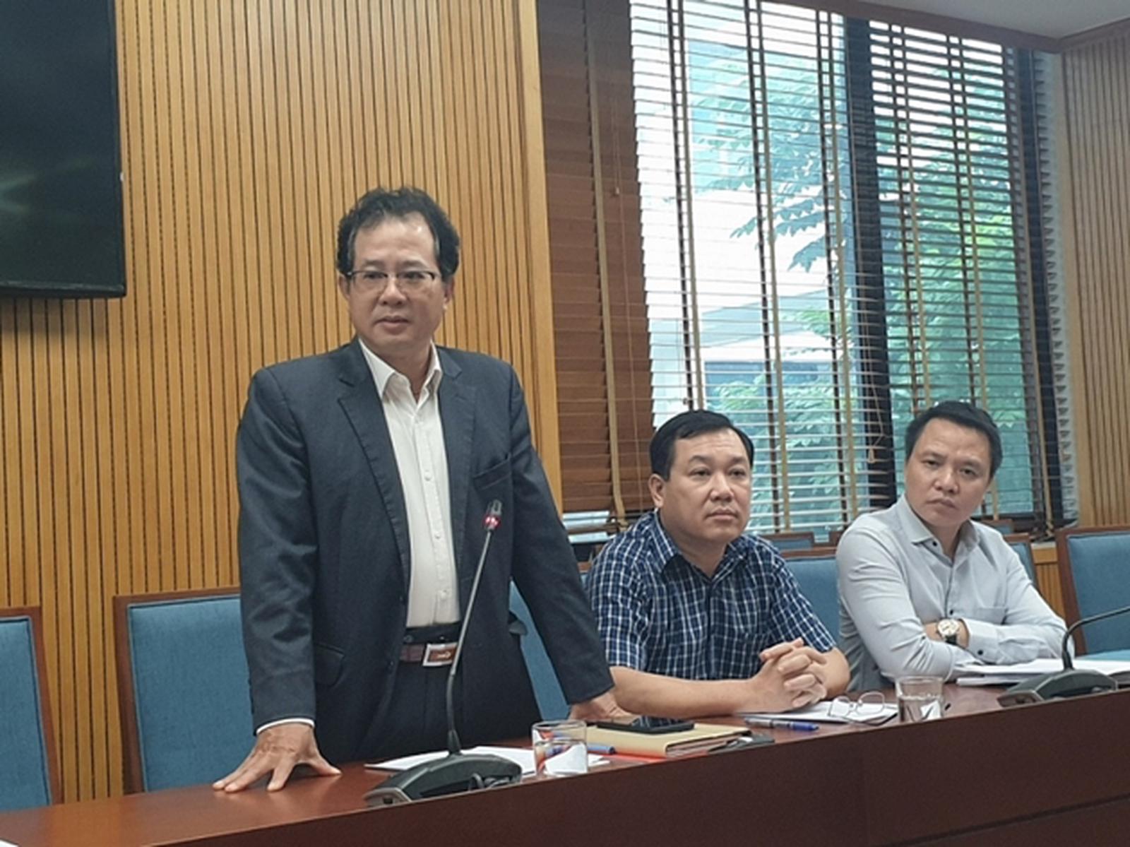 Ông Nguyễn Hoàng Hà, Phó Giám đốc Ban Quản lý dự án đầu tư xây dựng quận Đống Đa (người ngồi giữa) trong một buổi họp báo. Ảnh: Minh Anh