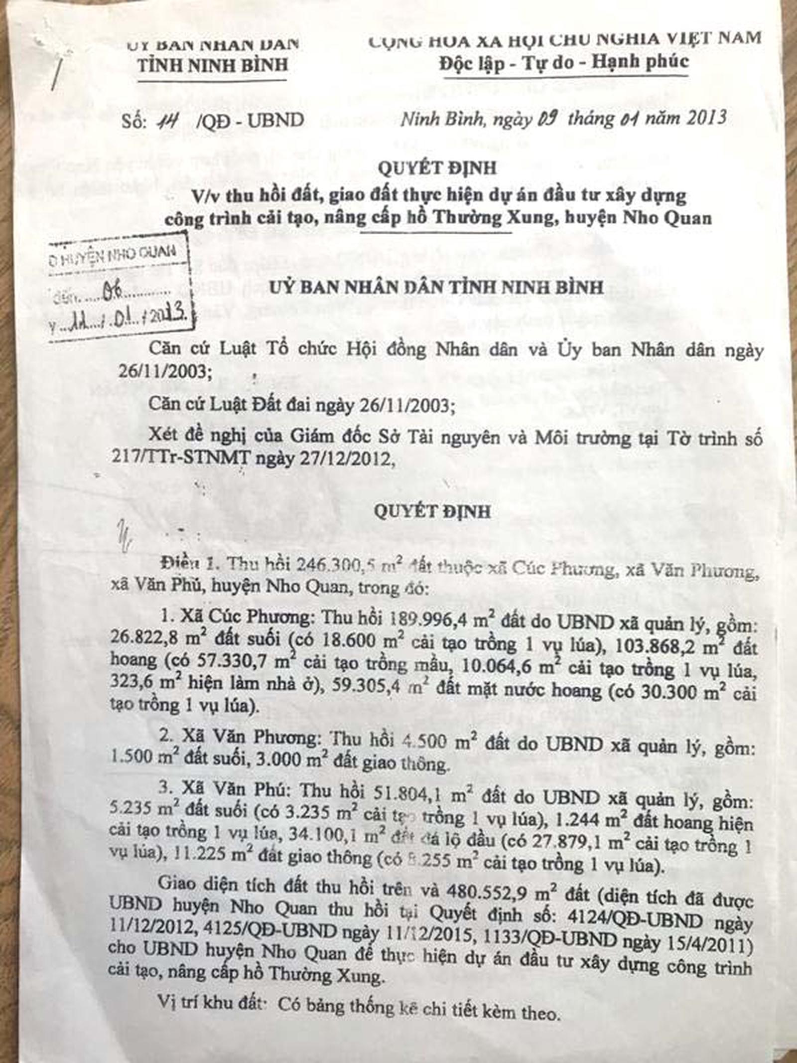 Thêm nữa, ngày 9/1/2013, UBND tỉnh Ninh Bình mới có Quyết định số 14 do ông Đinh Văn Điến, Phó Chủ tịch UBND tỉnh ký về thu hồi đất, giao đất thực hiện dự án đầu tư xây dựng công trình cải tạo, nâng cấp hồ Thường Xung, huyện Nho Quan.