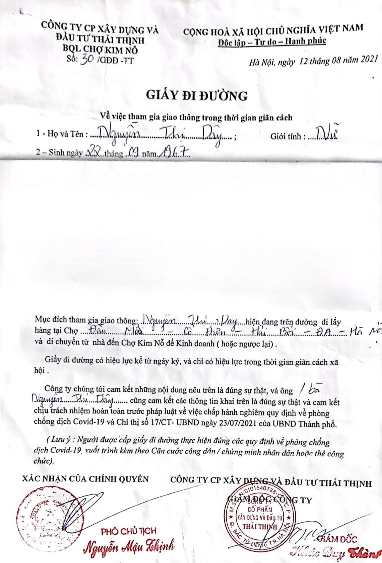 Theo tài liệu do người dân cung cấp, Ban Quản lý chợ Kim Nỗ cấp Giấy đi đường số 30/GĐĐ-TT ngày 12/8/2021 về việc tham gia giao thông trong thời gian giãn cách cho bà Nguyễn Thị Dây. Mục đích tham gia giao thông: Bà Dây hiện đang trên đường đi lấy hàng tại chợ Đầu Mối, Cổ Điển, Hải Bối, Đông Anh, Hà Nội và di chuyển từ nhà đến chợ Kim Nỗ để kinh doanh (hoặc ngược lại).