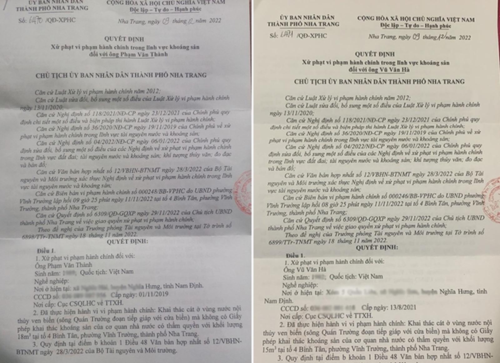 Ngày 9/12/2022, Chủ tịch UBND TP Nha Trang đã ra Quyết định số 6470/QĐ-XPHC xử phạt vi phạm hành chính trong lĩnh vực khoáng sản đối với ông Phạm Văn Thành; Quyết định số 6471/QĐ-XPHC xử phạt vi phạm hành chính trong lĩnh vực khoáng sản đối với ông Vũ Văn Hà.