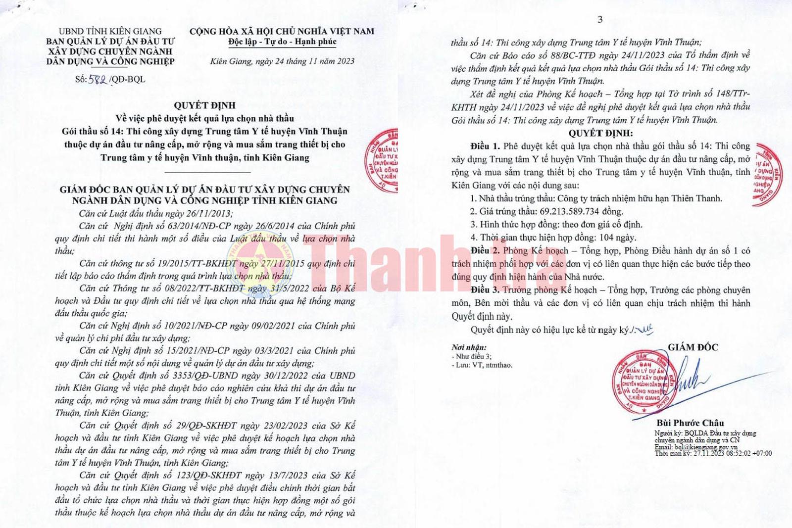 Tại gói thầu số 14 thi công xây dựng Trung tâm Y tế huyện Vĩnh Thuận thuộc dự án đầu tư nâng cấp, mở rộng và mua sắm trang thiết bị cho Trung tâm Y tế huyện, ngày 24/11/2023, ông Bùi Phước Châu - Giám đốc BQLDA dân dụng và công nghiệp Kiên Giang đã ký quyết định phê duyệt cho Công ty TNHH Thiên Thanh trúng thầu với giá trị hơn 69,213 tỷ đồng (giá gói thầu là hơn 69,302 tỷ đồng); tiết kiệm được gần 89 triệu đồng, tương đương 0,12% giá gói thầu.