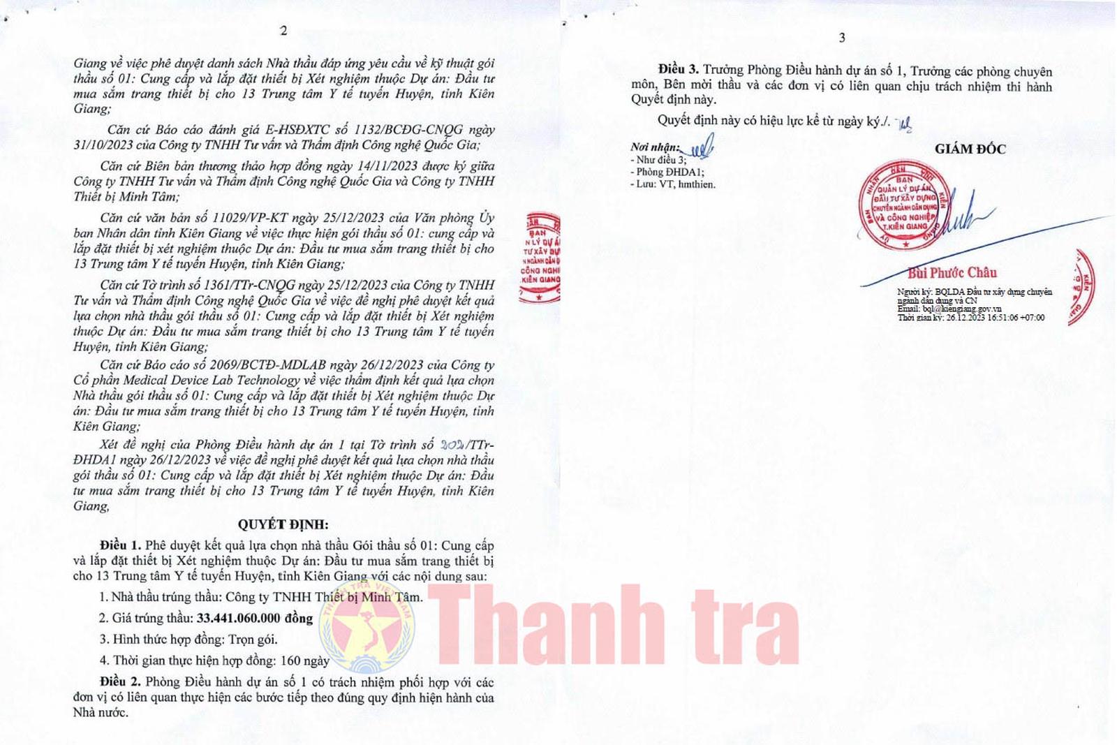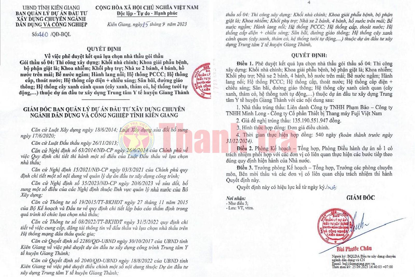 Tại gói thầu số 04 thi công xây dựng khối nhà chính, khoa giải phẫu bệnh… thuộc dự án đầu tư xây dựng Trung tâm Y tế huyện Giang Thành, ngày 25/9/2023, ông Bùi Phước Châu - Giám đốc BQLDA dân dụng và công nghiệp Kiên Giang đã ký quyết định phê duyệt cho Liên danh Công ty TNHH Phạm Bảo - Công ty TNHH Minh Long - Công ty CP Thiết bị thang máy Fuji Việt Nam trúng thầu với giá trị hơn 135,19 tỷ đồng (giá gói thầu là hơn 135,453 tỷ đồng); tiết kiệm được hơn 260 triệu đồng, tương đương 0,19% giá trị gói thầu.