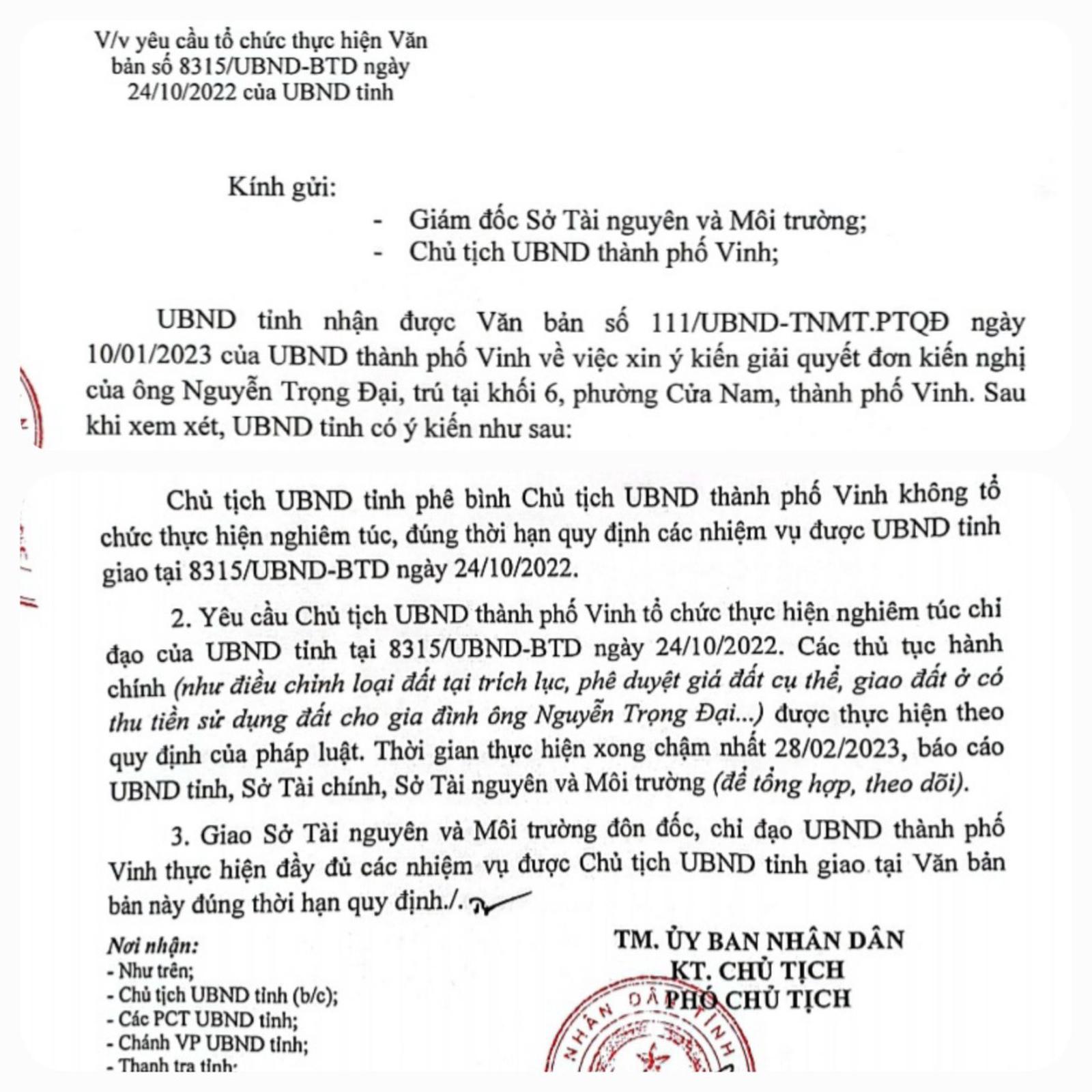 Từ đó, "Chủ tịch UBND tỉnh phê bình Chủ tịch UBND TP Vinh không tổ chức thực hiện nghiêm túc, đúng thời hạn quy định các nhiệm vụ được UBND tỉnh giao tại Văn bản số 8315/UBND-BTD ngày 24/10/2022. Yêu cầu Chủ tịch UBND TP Vinh tổ chức thực hiện nghiêm túc chỉ đạo của UBND tỉnh tại Văn bản số 8315. Các thủ tục hành chính (như điều chỉnh loại đất tại trích lục, phê duyệt giá đất cụ thể, giao đất ở có thu tiền sử dụng đất cho gia đình ông Đại...) được thực hiện theo quy định của pháp luật. Thời gian thực hiện xong chậm nhất ngày 28/2/2023, báo cáo UBND tỉnh, Sở Tài chính, Sở TN&MT".