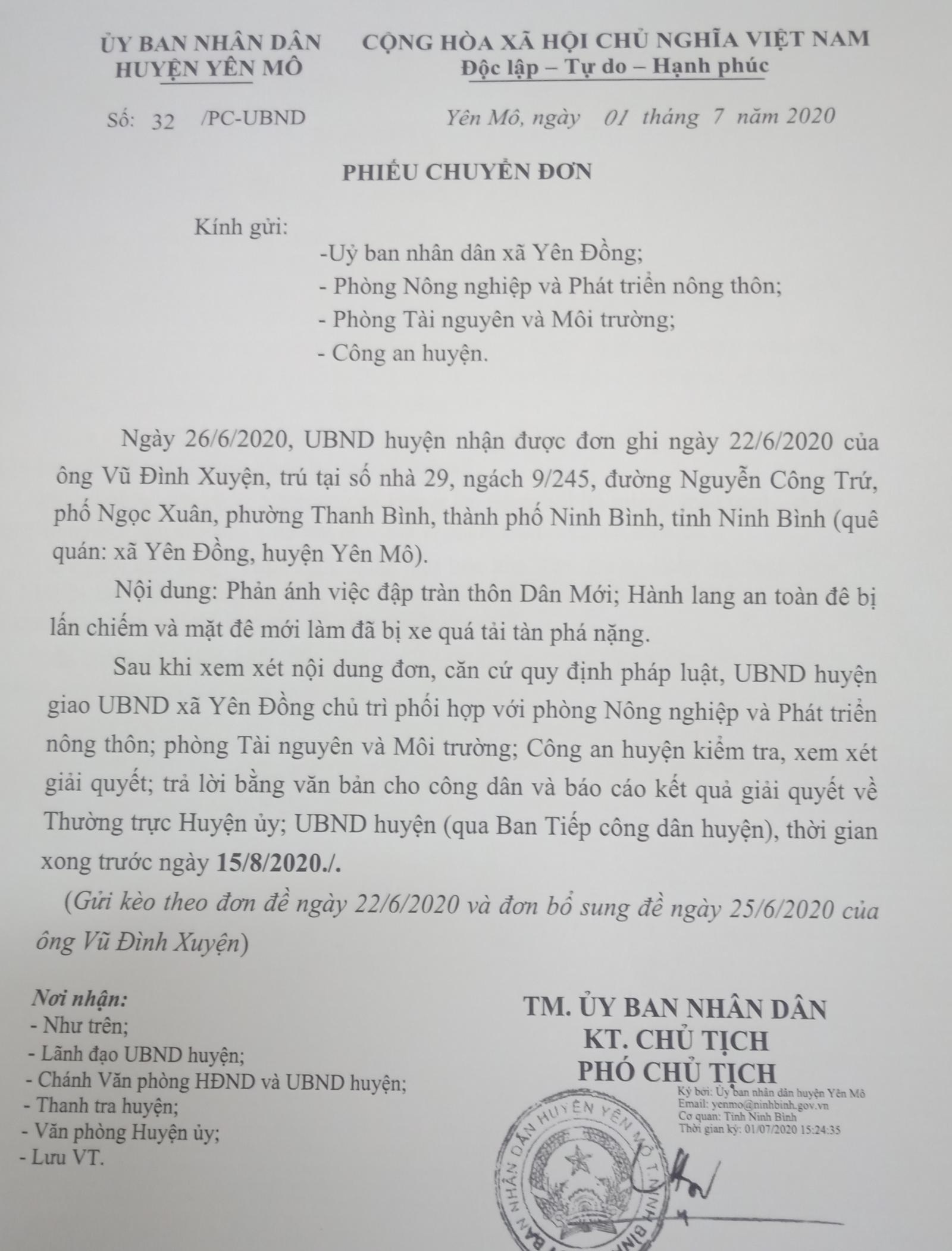 Thời gian qua, công dân có đơn thư phản ánh tình trạng xe chở quá tải vận chuyển nguyên vật liệu đi lại ngang nhiên trên tuyến đường đê thuộc địa phận thôn Dân Mới, xã Yên Đồng, huyện Yên Mô, tỉnh Ninh Bình, làm hư hỏng mặt đê mà không bị các cơ quan chức năng kiểm tra, xử lý.