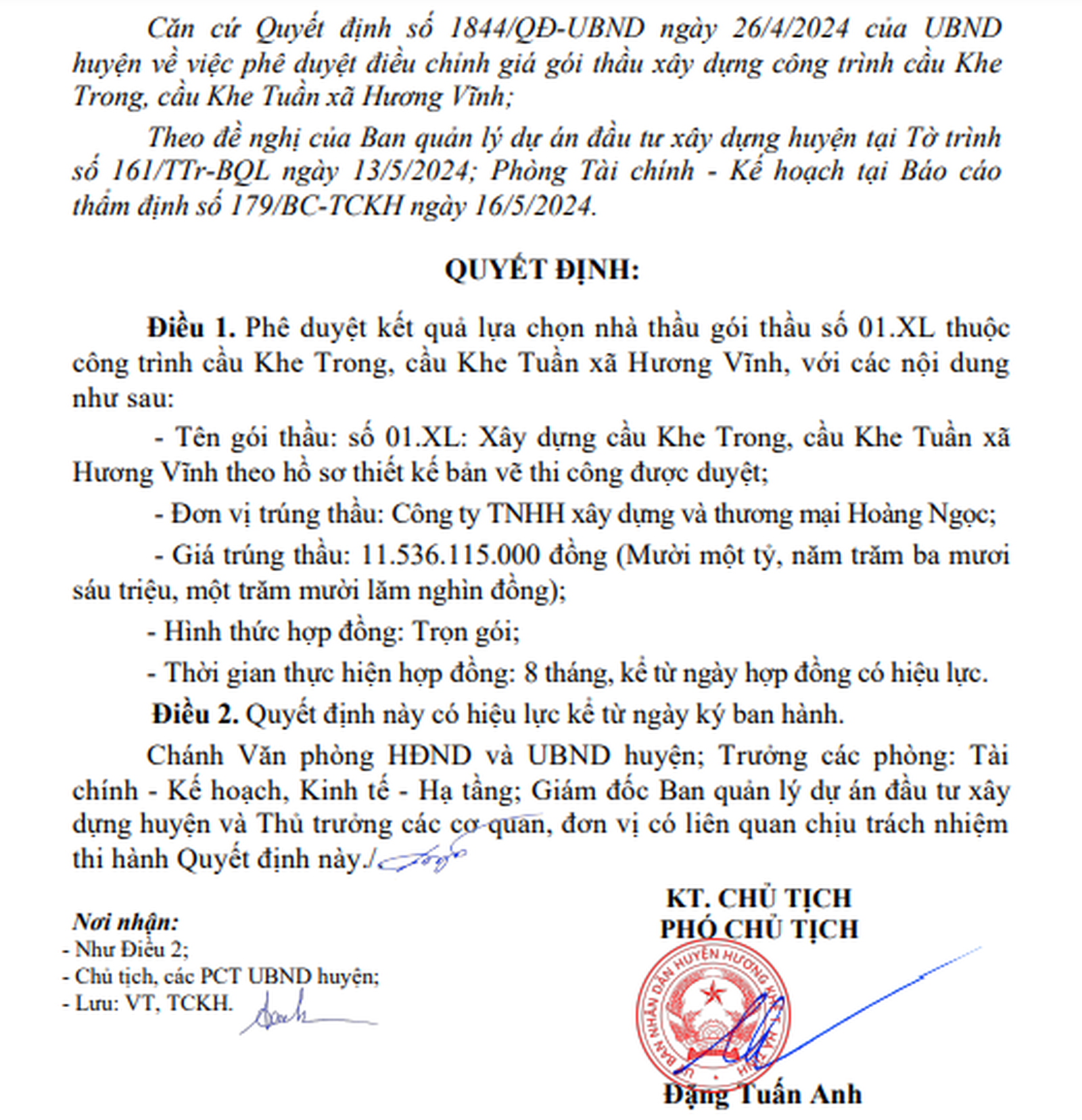 Ngày 23/5/2024, ông Đặng Tuấn Anh - Phó Chủ tịch huyện Hương Khê, tỉnh Hà Tĩnh đã ký Quyết định số 2351/QĐ-UBND về việc phê duyệt kết quả lựa chọn nhà thầu gói thầu số 01.XL thuộc công trình cầu Khe Trong, cầu Khe Tuần xã Hương Vĩnh. Gói thầu có giá dự toán 11,547 tỷ đồng.