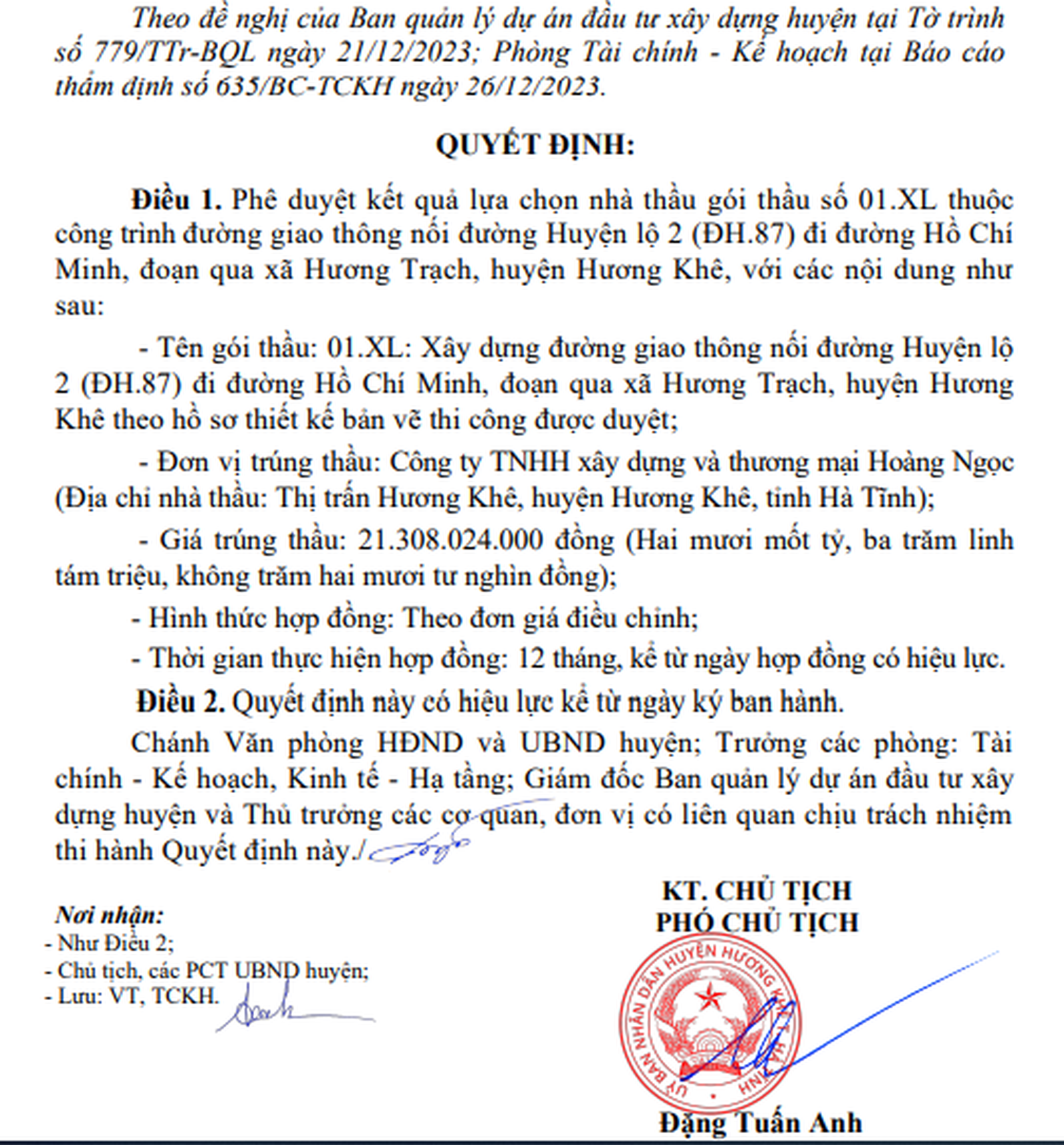 Hay vào ngày 27/12/2023, ông Đặng Tuấn Anh - Phó Chủ tịch UBND huyện Hương Khê ký Quyết định số 6382/QĐ-UBND phê duyệt kết quả lựa chọn nhà thầu gói thầu số 01.XL thuộc công trình đường giao thông nối đường Huyện lộ 2 (ĐH.87) đi đường Hồ Chí Minh, đoạn qua xã Hương Trạch, huyện Hương Khê.