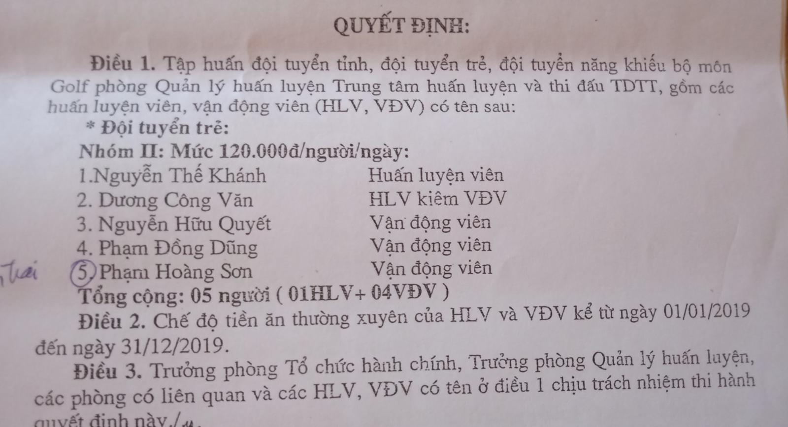 Quyết định cho các vận động viên đi tập huấn, trong có tên con ông Minh là Phạm Hoàng Sơn. Ảnh: VT