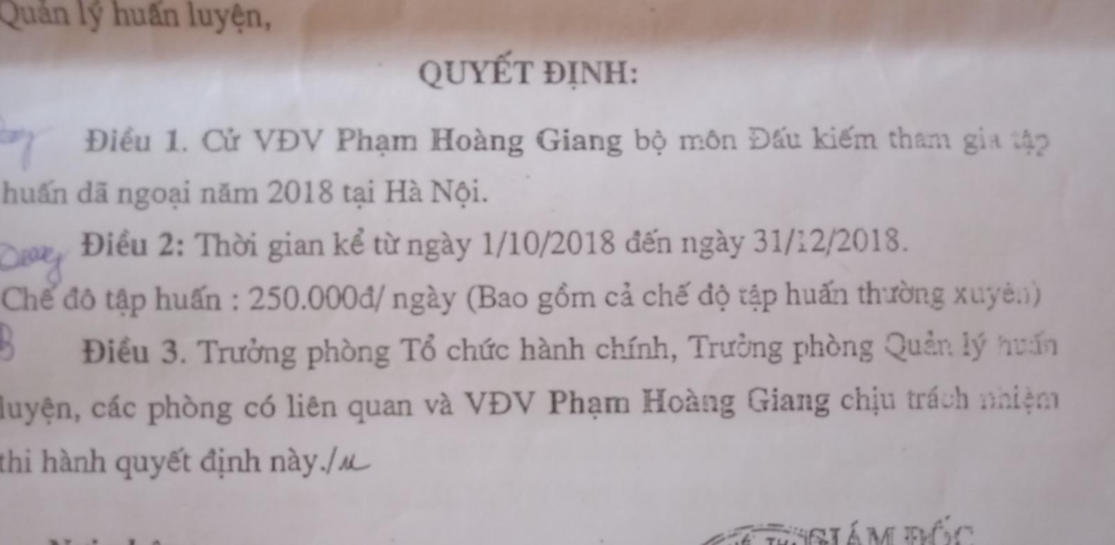 Thứ hai, tại Quyết định 371/QĐ-TTHLTĐTDTT ngày 10/10/2018 do cũng do lãnh đạo Trung tâm Huấn luyện thi đấu TDTT ký, đóng dấu cử vận động viên Phạm Hoàng Giang, bộ môn đấu kiếm tham gia tập huấn giã ngoại tại Hà Nội từ ngày 1/10/2018 đến ngày 31/12/2018. Chế độ tập huấn 250.000 đồng/ngày (bao gồm cả chế độ tập huấn thường xuyên). Theo tìm hiểu, Phạm Hoàng Giang cũng là con trai của ông Phạm Hồng Minh, hiện đang theo học tại một trường THCS trên địa bàn TP Thanh Hóa.