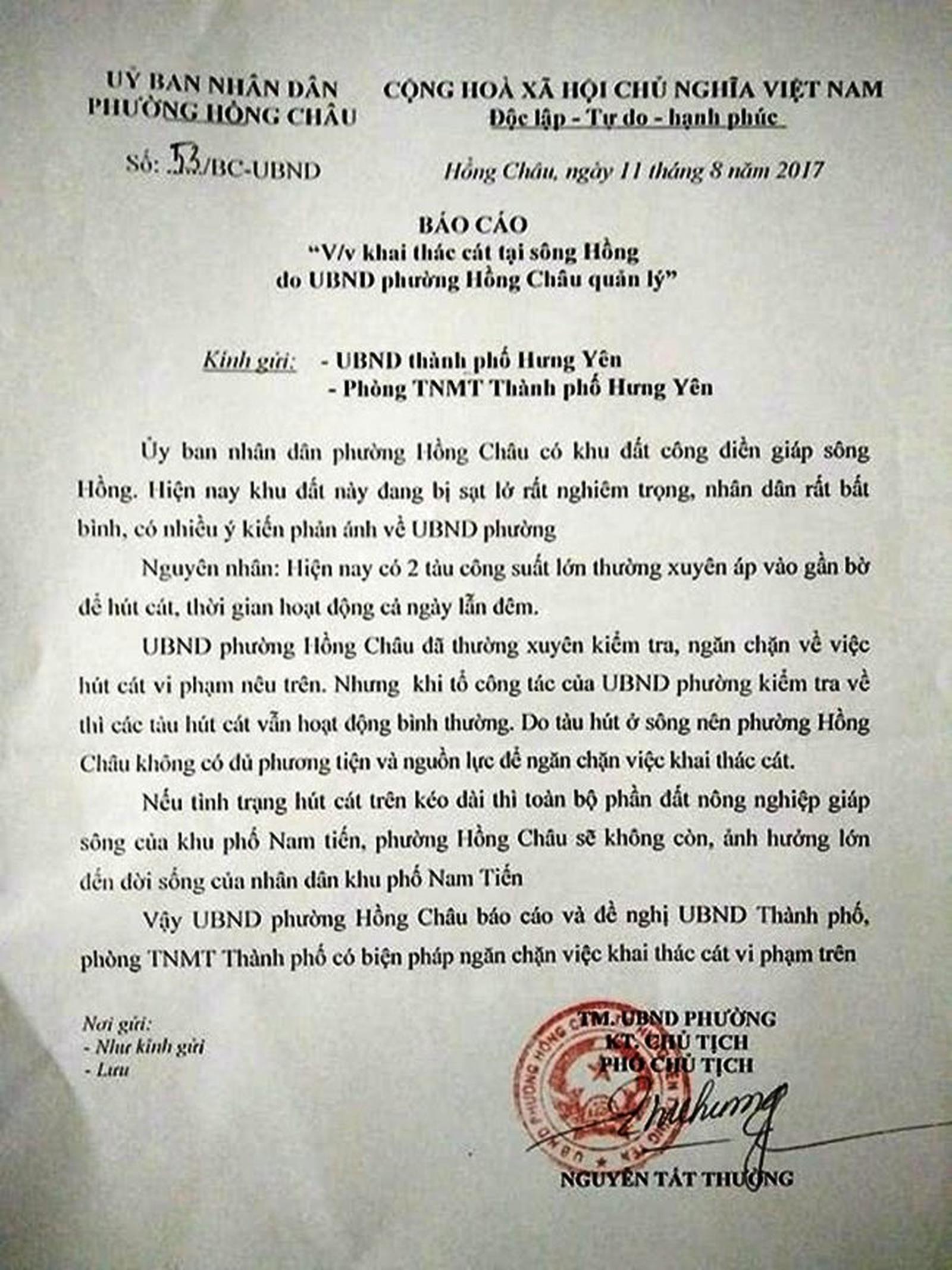 Văn bản của UBND phường Hồng Châu ghi nhận về hoạt động của "cát tặc". Ảnh: ND