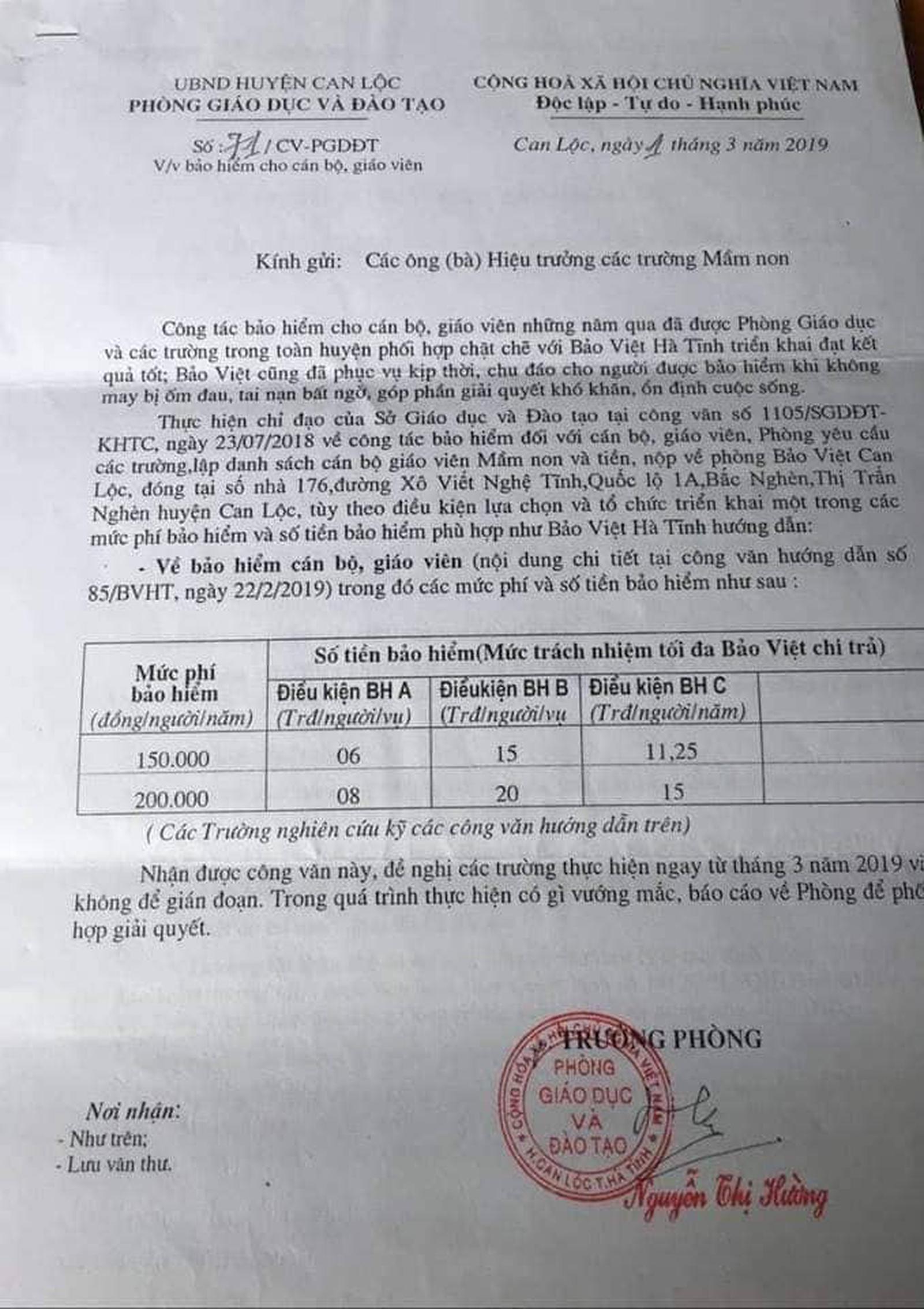 Sự việc xảy ra vào ngày 1/3 vừa qua, Phòng GD&ĐT huyện Can Lộc ra công văn yêu cầu các trường bậc mầm non trên địa bàn lên danh sách cán bộ, giáo viên mang tiền về văn phòng đơn vị Bảo hiểm Bảo Việt đóng trên địa bàn để đóng các khoản bảo hiểm thân thể.