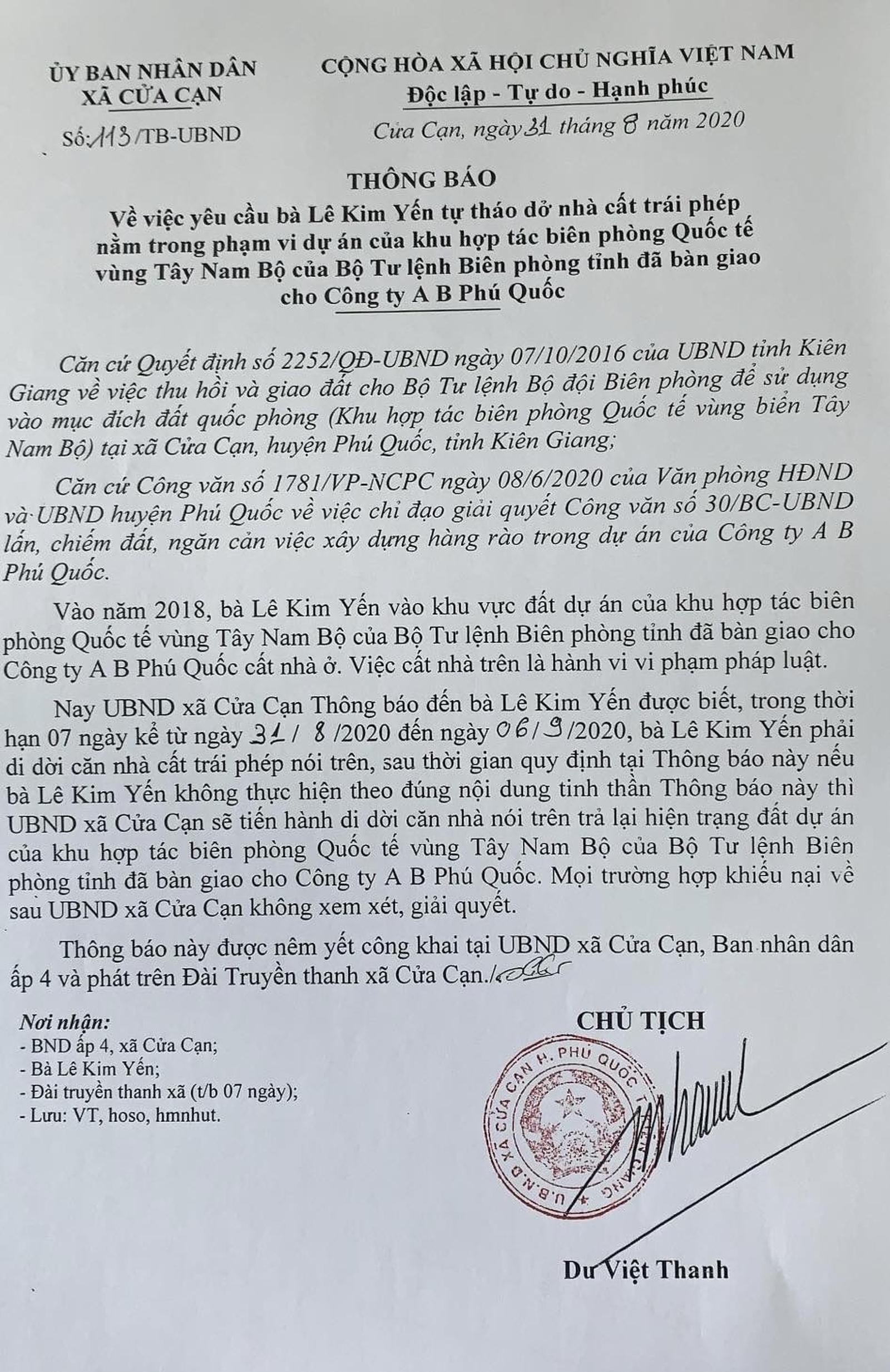 Được biết, ngày 31/8/2020, Chủ tịch UBND xã Cửa Cạn Du Việt Thanh đã ký Thông báo số 113/TB-UBND về việc yêu cầu bà Lê Kim Yến tự tháo dỡ nhà cất trái phép nằm trong phạm vi dự án của Khu Hợp tác biên phòng Quốc tế vùng Tây Nam Bộ của Bộ Tư lệnh Biên phòng tỉnh đã bàn giao cho Công ty Cổ phần AB Phú Quốc trong thời hạn 7 ngày.