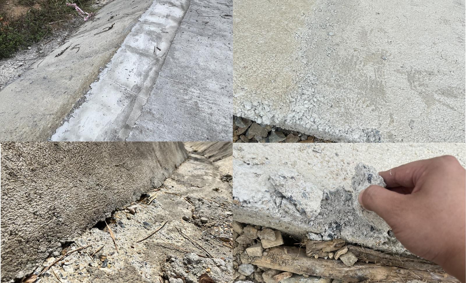 Tuy nhiên, theo quan sát của chúng tôi, để có thể đổ kín nền đường, đơn vị thi công đã dùng bê tông trám lại phần mặt đường còn thiếu (có thể do khoảng cách 2 bên bờ mái taluy và nền đường bê tông không trùng nhau). Phần trám bằng bê tông bị nứt chằng chịt, thi công một cách cẩu thả.