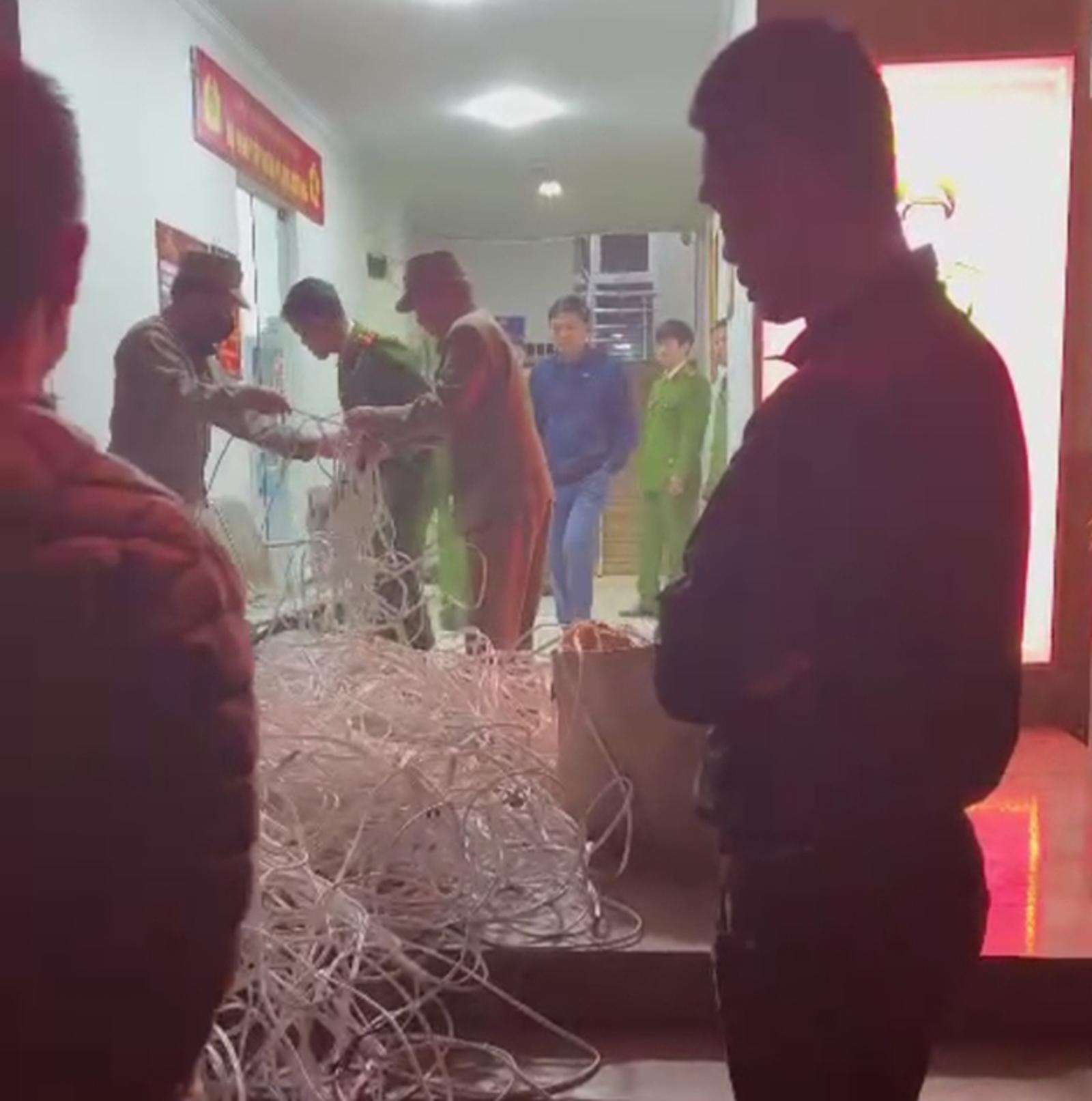 Hệ thống dây cáp bị cắt phá được mang về Công an phường Hoàng Liệt. Ảnh cắt ra từ clip