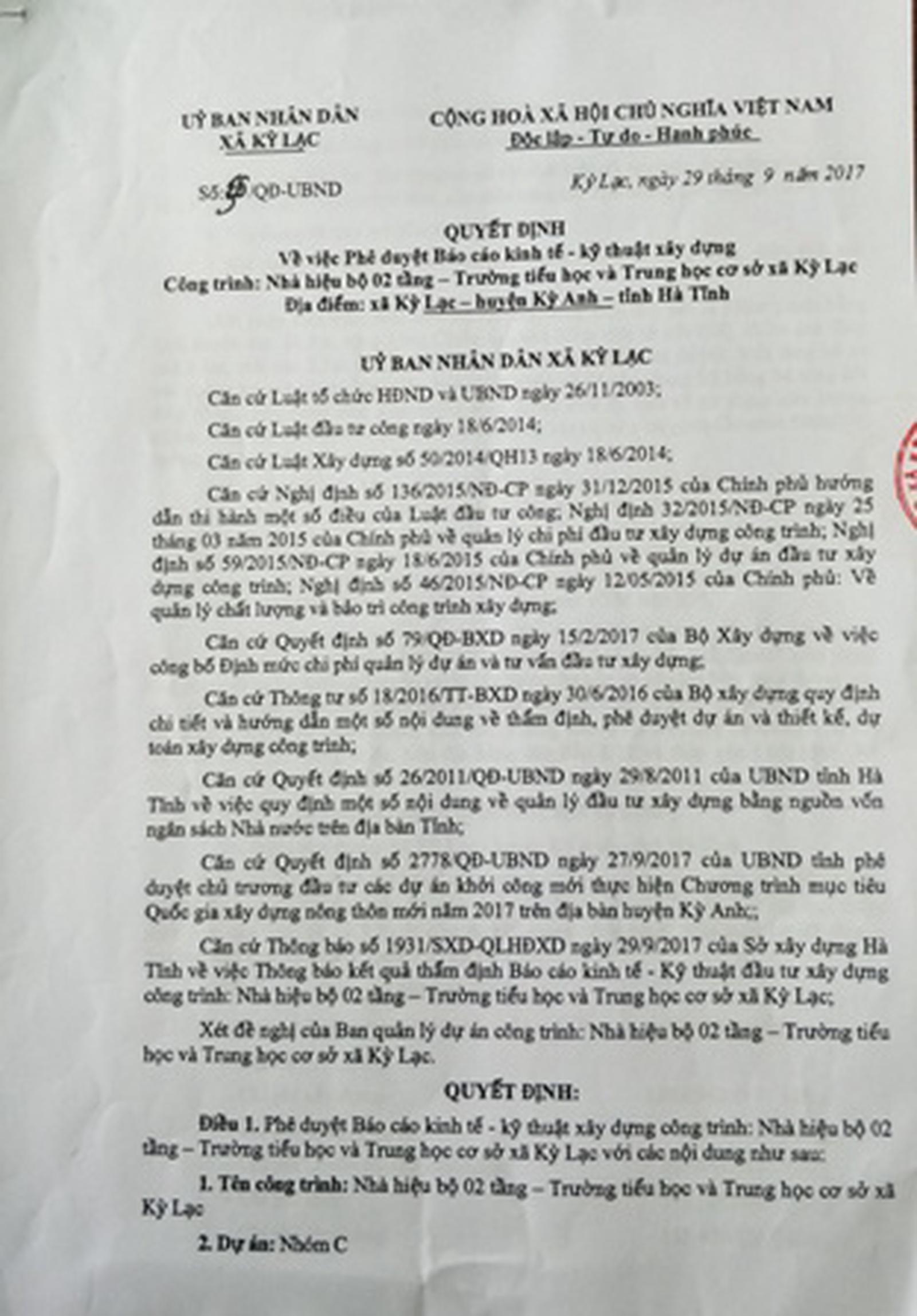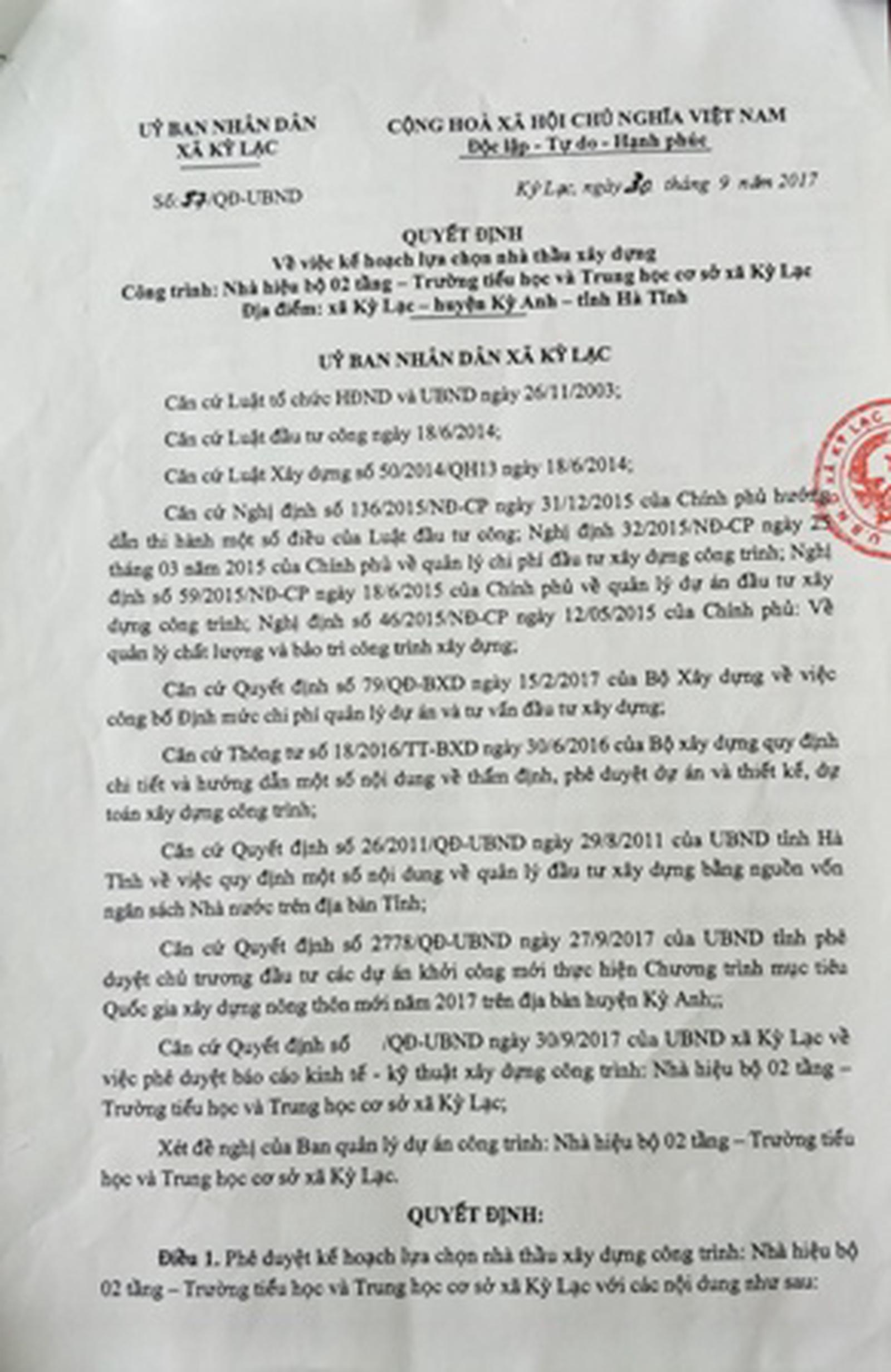 Theo thông tin UBND xã Kỳ Lạc, huyện Kỳ Anh đăng trên báo chí, gói thầu có tên là Nhà hiệu bộ 2 tầng Trường Tiểu học và Trung học cơ sở xã Kỳ Lạc, thời gian phát hành hồ sơ mời thầu từ 7h30 ngày 20/11/2017 đến 8h00 ngày 30/11/2017 (trong giờ hành chính). Địa điểm phát hành tại Văn phòng UBND xã Kỳ Lạc, huyện Kỳ Anh.