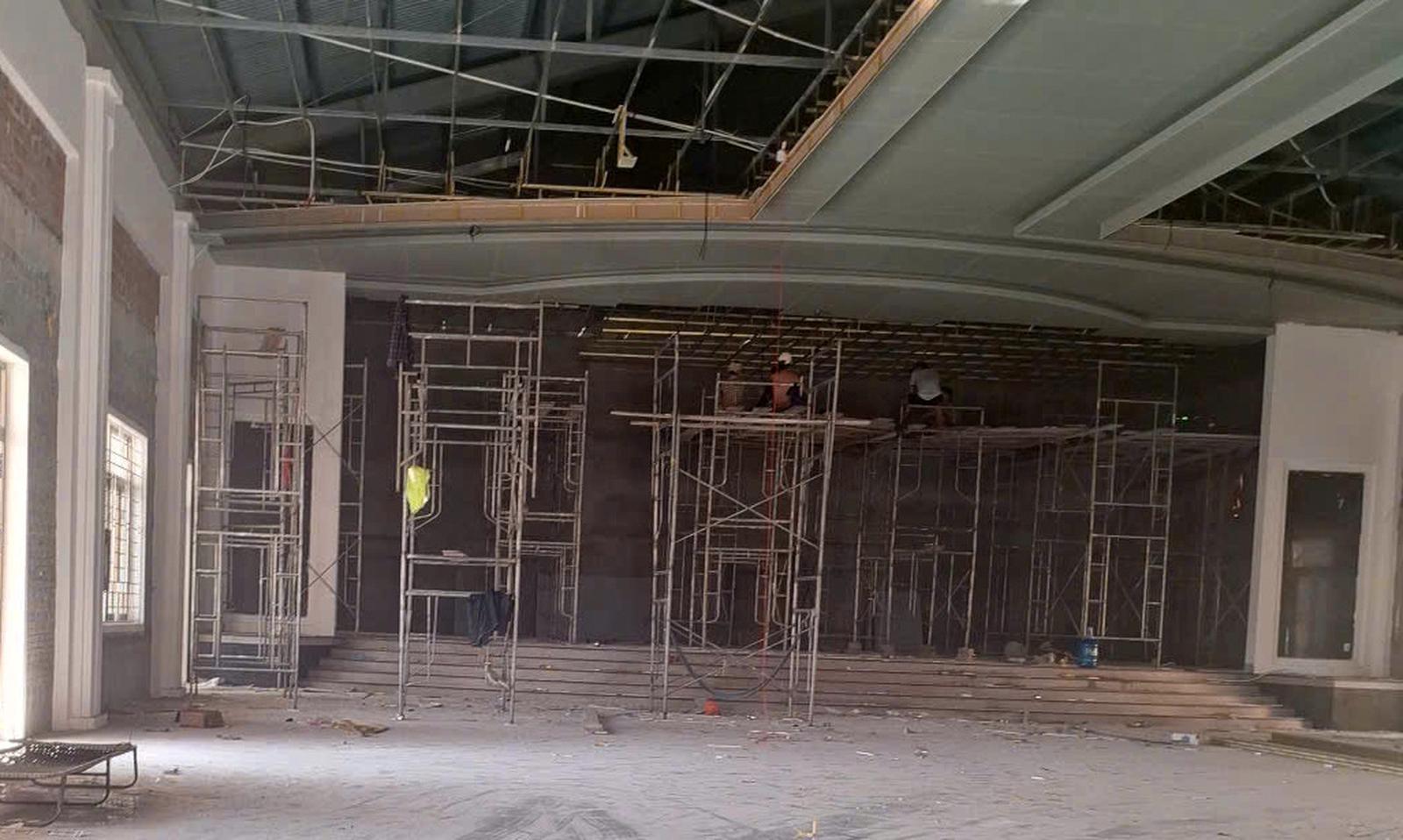 Dù đã có văn bản chỉ đạo của Ban Thường vụ Tỉnh ủy Quảng Trị, nhưng bên trong công trình hội trường Huyện ủy Hướng Hóa, nhân công vẫn tiếp tục thi công phần trần. Ghi nhận của phóng viên lúc 15 giờ 14 phút ngày 15/3/2025. Ảnh: Minh Tân