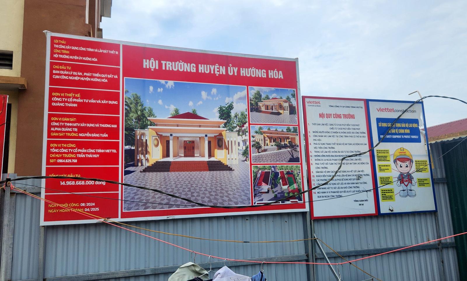 Đến tháng 7/2024, BQL DA huyện Hướng Hóa đã ban hành quyết định phê duyệt lựa chọn nhà thầu gói thầu thi công xây dựng công trình và lắp đặt thiết bị thuộc công trình hội trường Huyện ủy Hướng Hóa. Trong đó, đơn vị trúng thầu là Tổng Công ty cổ phần công trình Viettel (có địa chỉ tại số 1 Giang Văn Minh, phường Kim Mã, quận Ba Đình, Thành phố Hà Nội). Giá trúng thầu của nhà thầu này là gần 9,46 tỷ đồng, giảm gần 20% so với giá mời thầu. Đây cũng là nhà thầu có giá dự thầu thấp nhất.