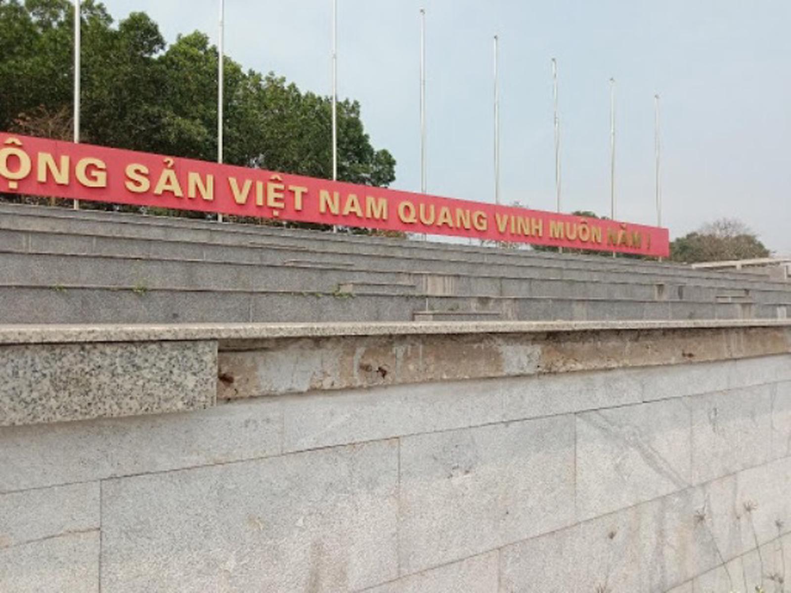 Tại hạng mục sân khấu và khu vực khán đài quảng trường hiện đá ốp lan can và nhiều vị trí tại các bậc lên sân khấu bị bong tróc, rơi vỡ rất nhiều mảnh; các thanh dầm chịu lực của lan can cũng bị nứt vỡ trơ thép ra ngoài. Nền sân khấu lát đá granit màu đỏ đã bị sụt lún, nứt nẻ nghiêm trọng.
