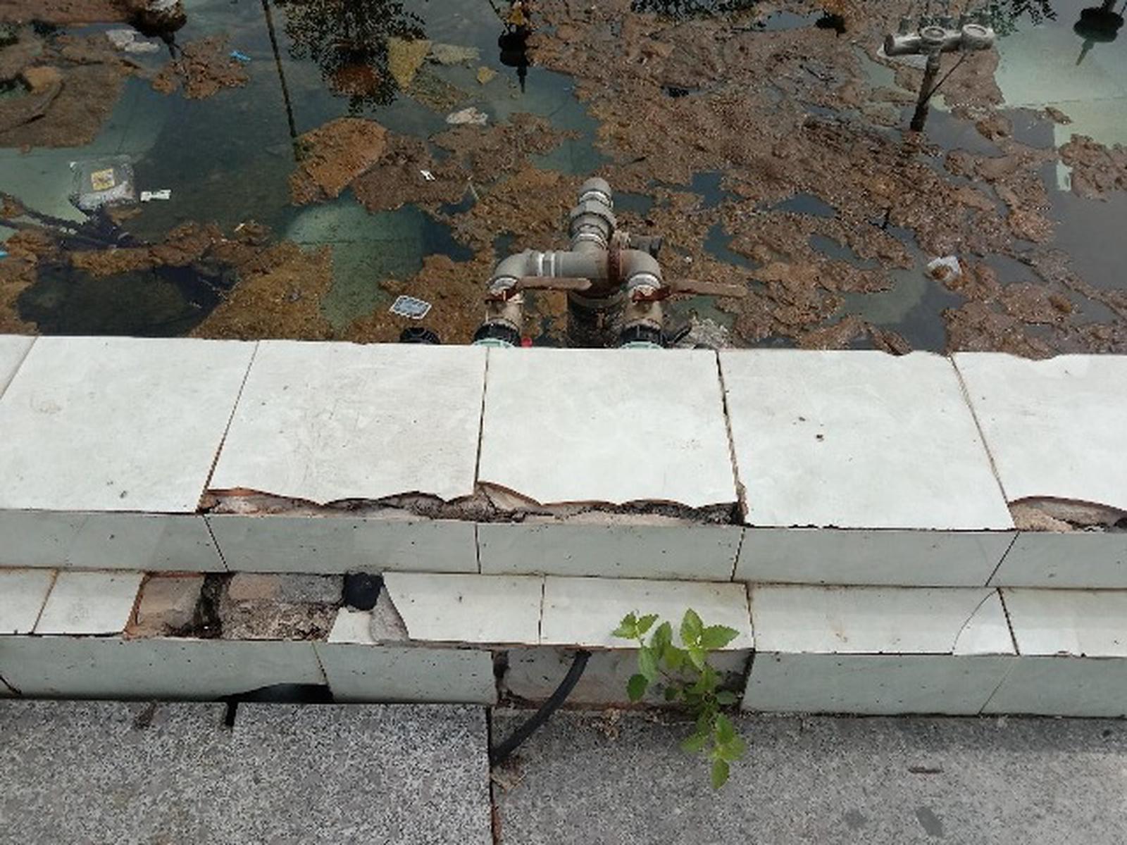 Đối diện khán đài là hạng mục đài phun nước trang trí đã bị hoen rỉ, bên trong hồ nước mô phỏng là cụm rêu mốc trộn lẫn với rác thải bẩn thỉu, đen đúa.