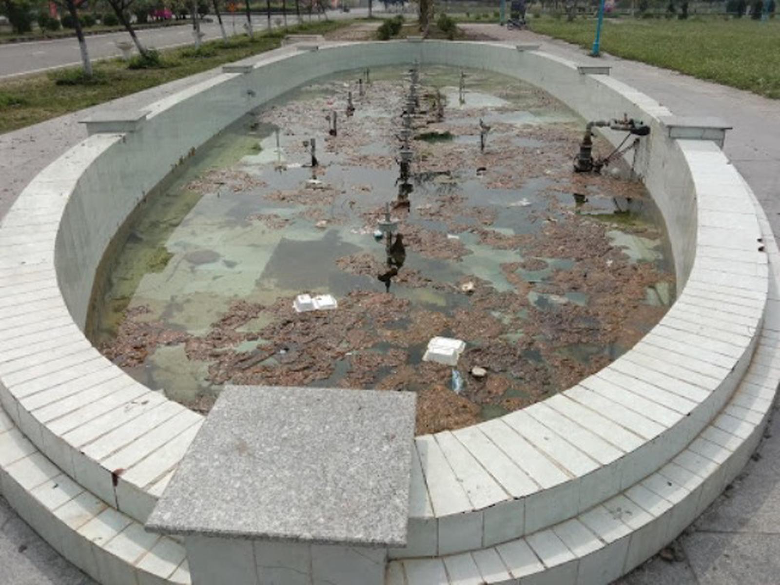 Hạng mục vòi phun nước quảng trường huyện Nghĩa Đàn hư hỏng, ô nhiễm. Ảnh: Xuân Thống