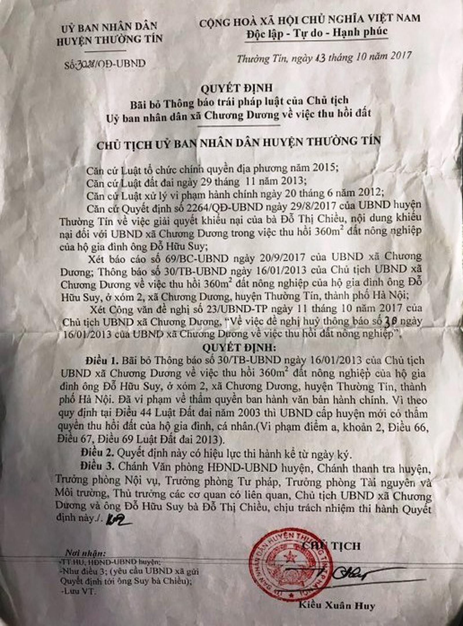 Mới đây, UBND huyện Thường Tín đã ban hành Quyết định số 3028 và 3029 ngày 13/10/2017 về việc “hủy bỏ thông báo trái luật của Chủ tịch UBND xã Chương Dương về việc thu hồi đất của các hộ dân”. Quyết định này đã nêu: Điều 1. Bãi bỏ Thông báo số 30/TB-UBND ngày 16/1/2013 của UBND xã Chương Dương về việc thu đất nông nghiệp của 2 trường hợp là bà Trần Thị Lệ và Đỗ Thị Chiều đã vi phạm về thẩm quyền ban hành văn bản hành chính. Vì theo quy định tại Điều 44 Luật Đất đai năm 2003 thì UBND cấp huyện mới có thẩm quyền thu hồi đất của hộ gia đình, cá nhân (vi phạm điểm a, khoản 2, Điều 66, Điều 67, Điều 69 Luật Đất đai 2013).