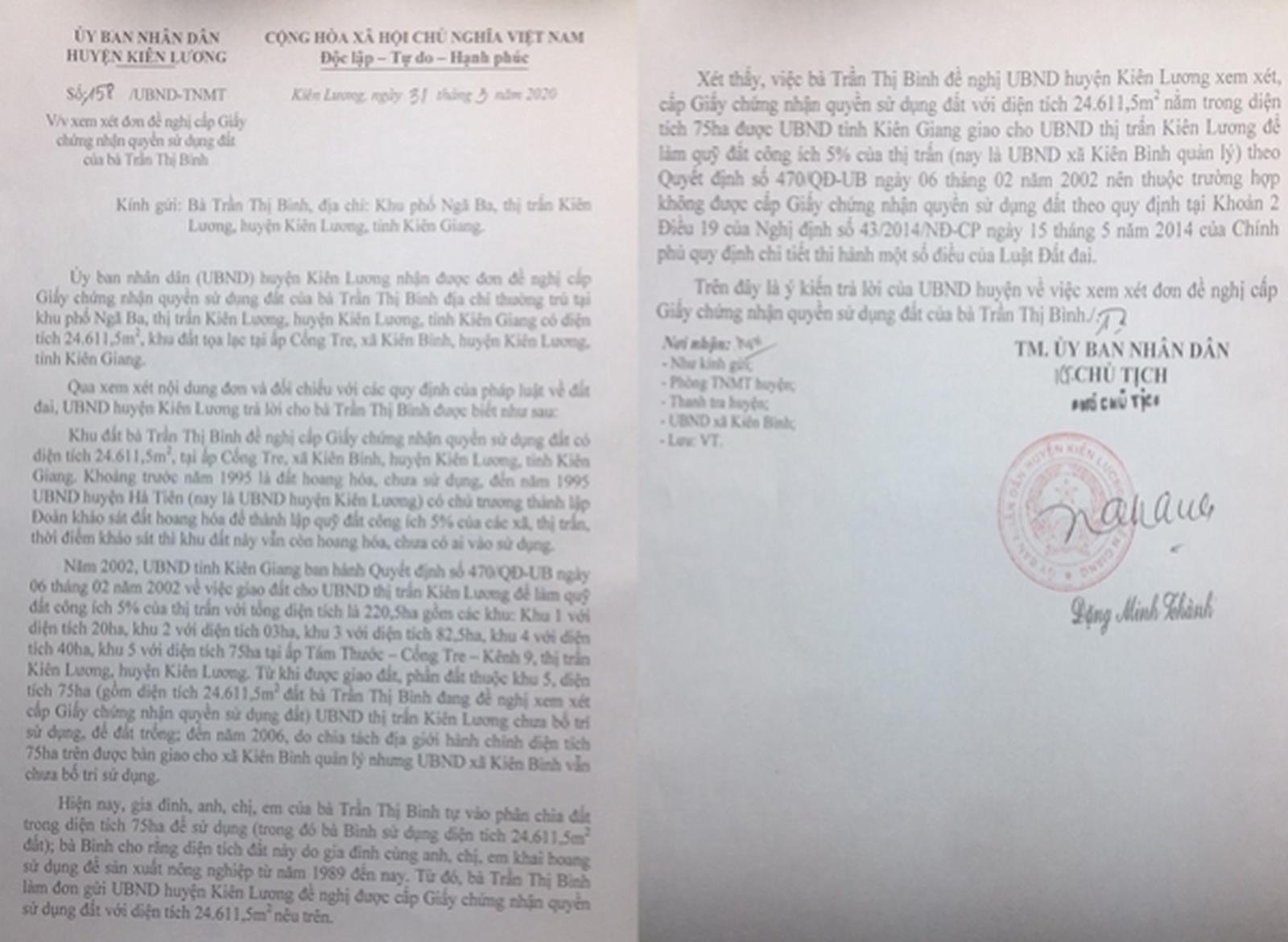 Đến ngày 31/3/2020, ông Đặng Minh Thành, Phó Chủ tịch UBND huyện Kiên Lương ký văn bản trả lời (không phải quyết định giải quyết KN) cho bà Bình về việc cấp GCNQSDĐ cho hơn 24.000m2 (trong gần 60ha đất do chị em bà khai khẩn từ năm 1989).