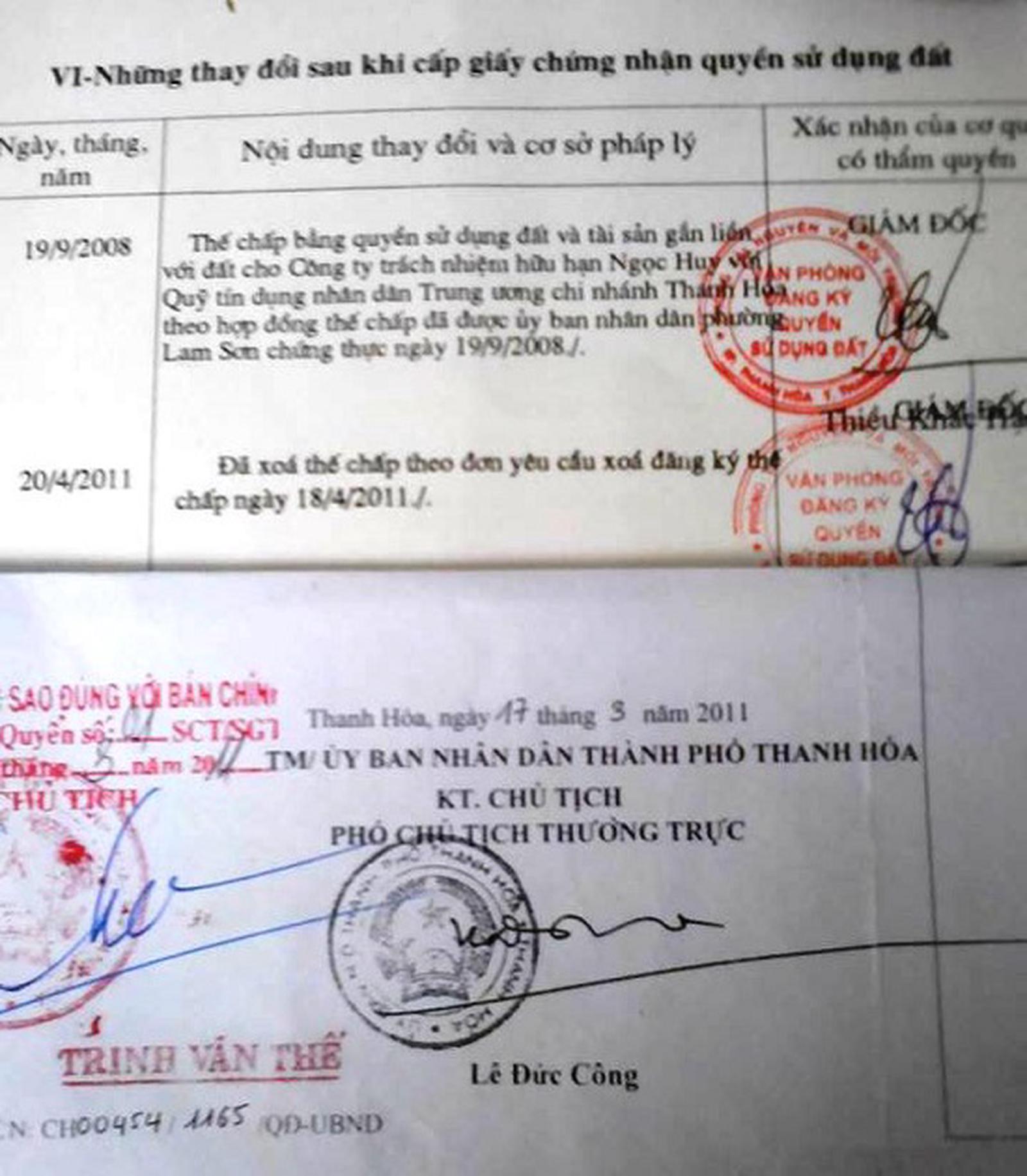 Năm 2011, bà Cúc thế chấp “sổ đỏ” số AG 725751 này tại Quỹ Tín dụng nhân dân Trung ương tại Thanh Hóa để vay tiền.