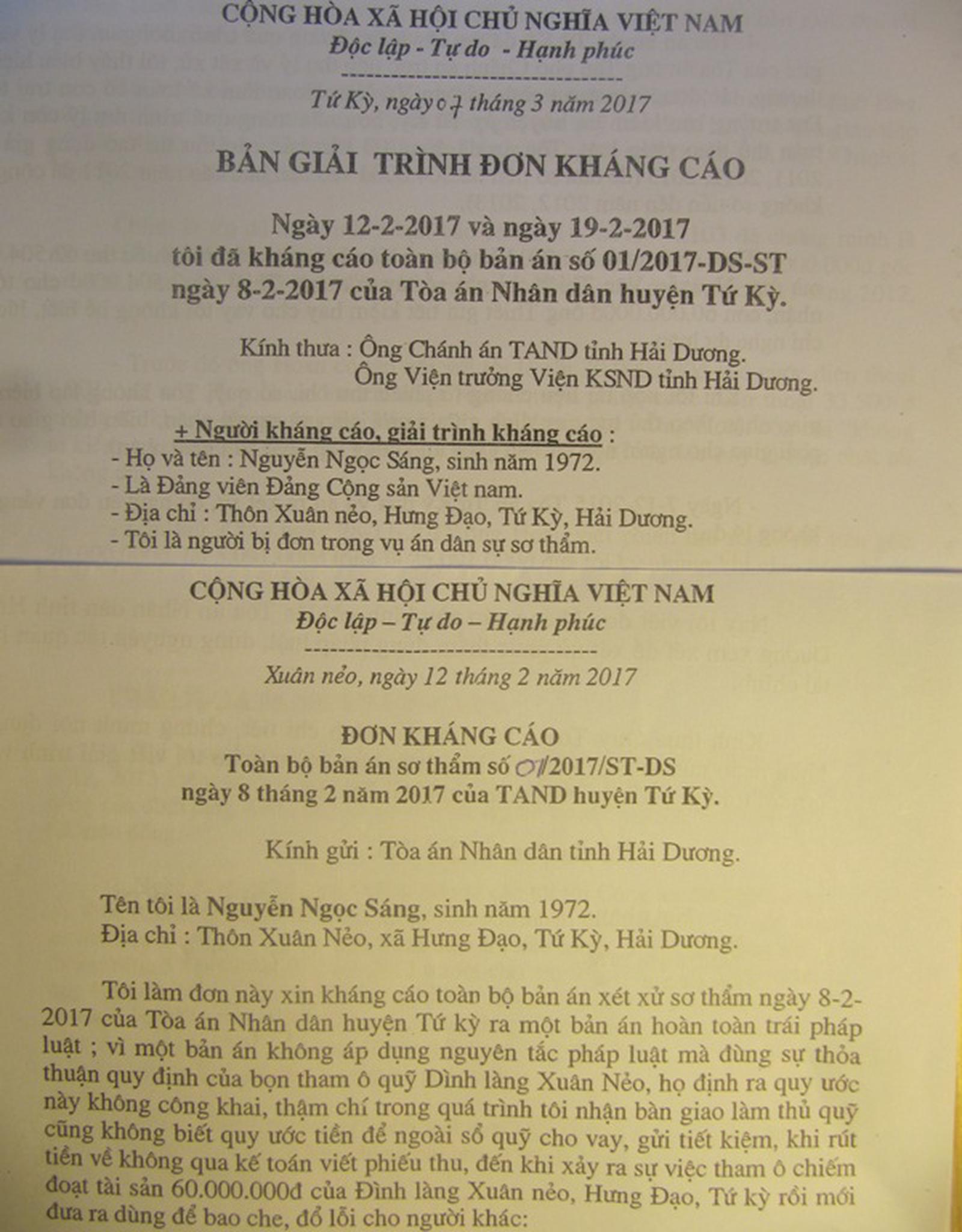 Nội dung đơn kháng cáo và bản giải trình đơn kháng cáo của ông Nguyễn Ngọc Sáng nêu: Tòa án nhân dân huyện Tứ Kỳ đã dùng 3 bản báo cáo thu chi tạo dựng giả năm 2011, 2012, 2013 để đưa số tiền trên 62,5 triệu đồng vào bản báo cáo năm 2011 để cộng dồn khống số tiền đến năm 2012, 2013. Những tài liệu xác minh thu thập chứng cứ của Cơ quan Điều tra trong vụ án đã bị tòa bỏ qua, không đánh giá nhận xét tổng hợp là thiếu khách quan…