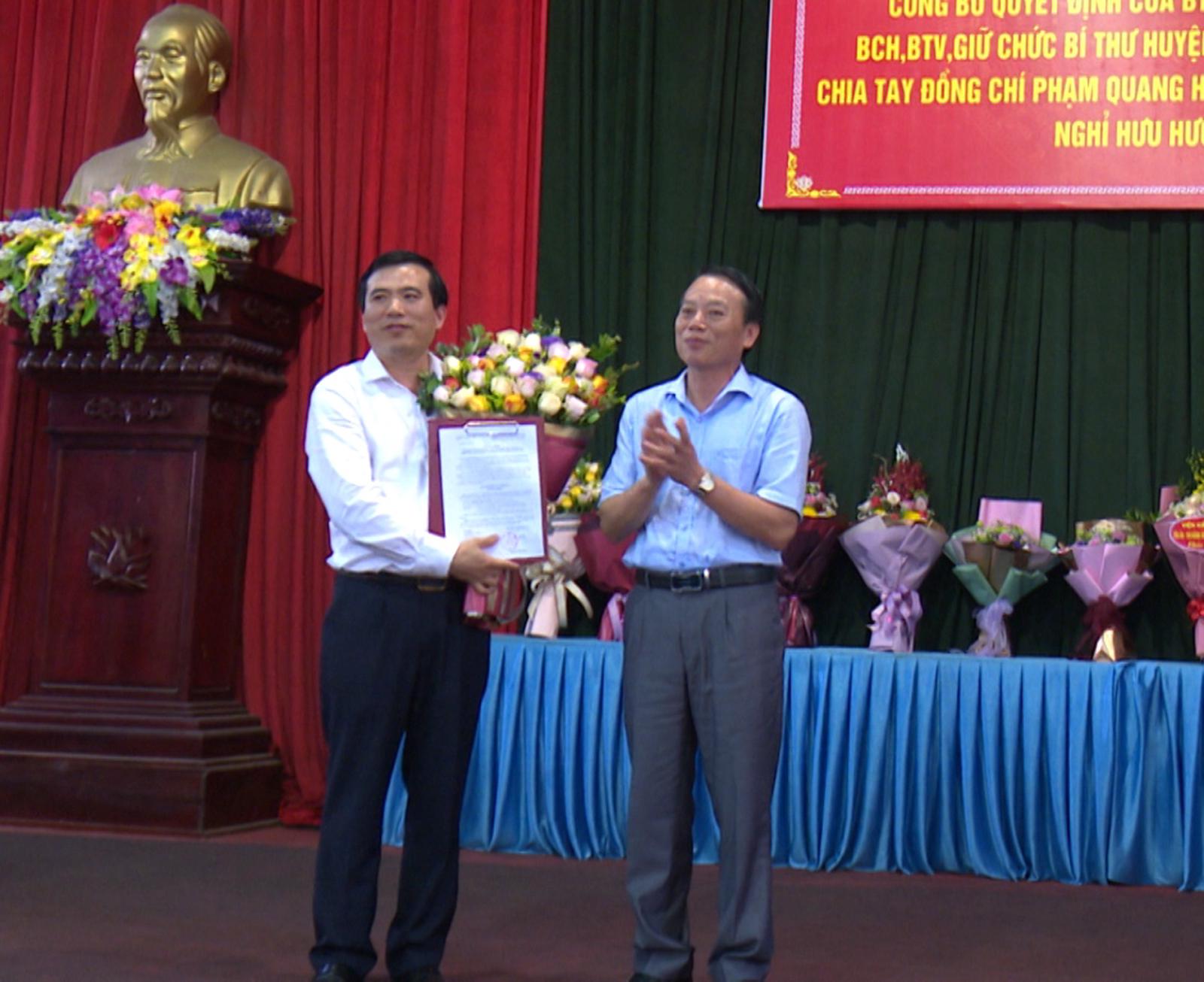 Ông Nguyễn Minh Tường (bên trái) nguyên Giám đốc Sở GDĐT Phú Thọ vừa mới nhận quyết định điều động làm Bí thư Huyện ủy Thanh Thủy. Ảnh: Hòa Tuân