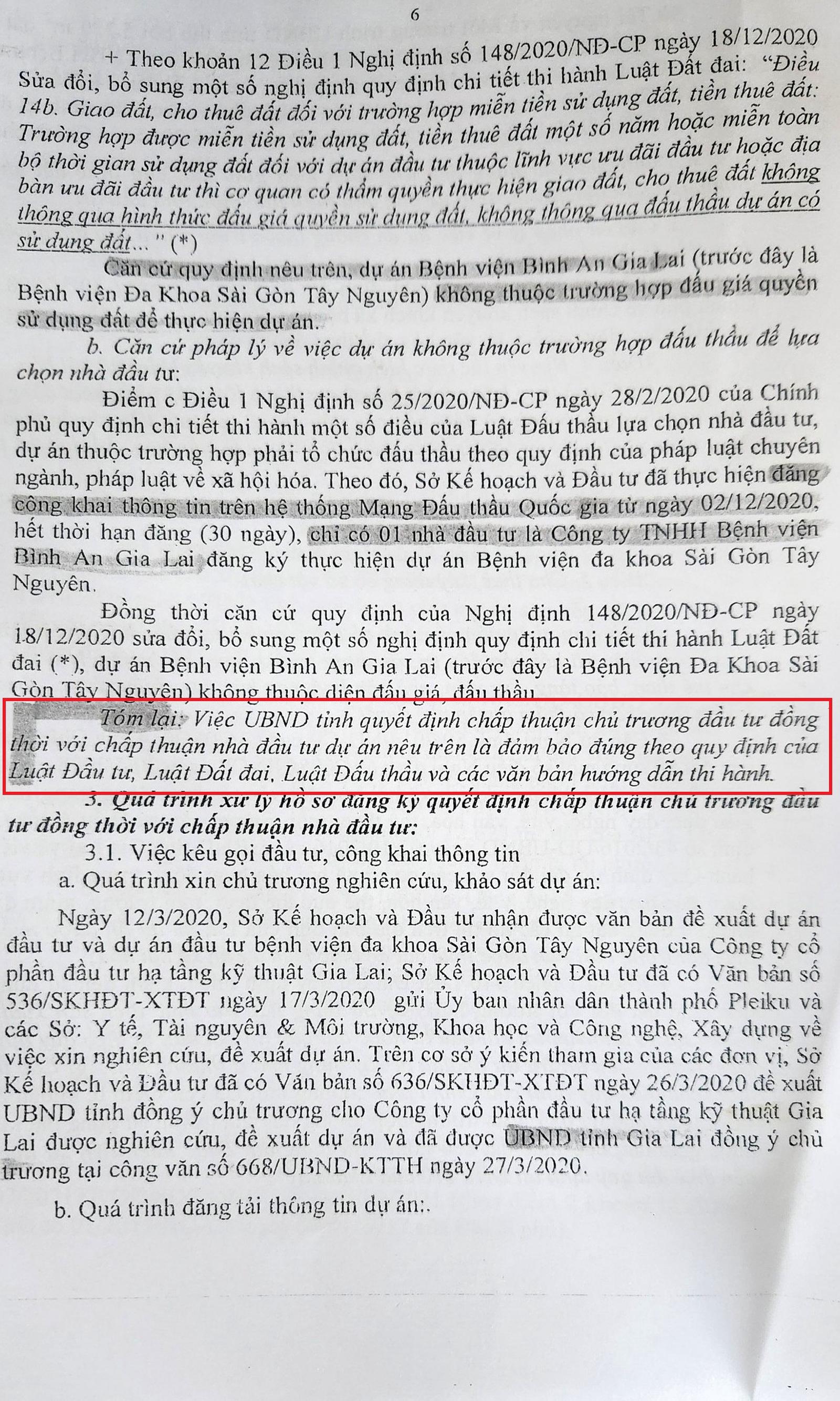 Tại công văn này, liên quan đến việc rà soát quá trình xử lý, trong đó có vấn đề phương án sắp xếp lại, xử lý tài sản công, các điều kiện giao đất, cho thuê đất không thông qua đấu giá quyền sử dụng đất, đấu thầu lựa chọn nhà đầu tư, Sở KH&ĐT khẳng định: Việc UBND tỉnh quyết định chấp thuận chủ trương đầu tư đồng thời với chấp thuận nhà đầu tư dự án BV Bình An Gia Lai là đảm bảo đúng quy định của Luật Đầu tư, Luật Đất đai, Luật Đấu thầu và các văn bản hướng dẫn thi hành.