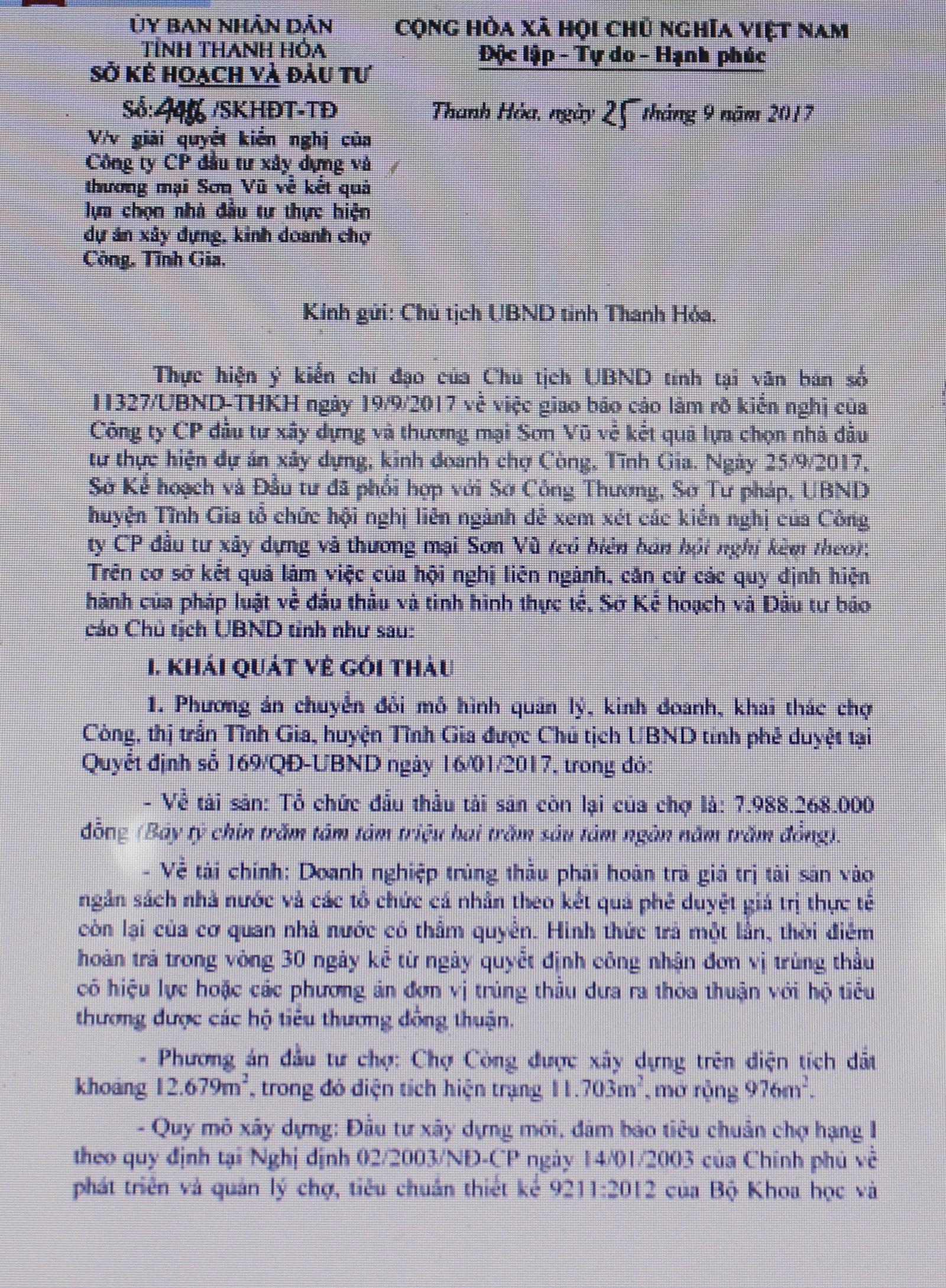Trước đó, ngày 15/9, Văn phòng Chính phủ có Văn bản 9805 do Bộ trưởng, Chủ nhiệm Mai Tiến Dũng ký gửi UBND tỉnh Thanh Hóa với nội dung: Thực hiện ý kiến chỉ đạo của Thủ tướng Chính phủ tại Công văn số 9800 ngày 15/11/2016 về việc tiếp nhận, xử lý phản ánh, kiến nghị của doanh nghiệp và Nghị quyết số 35/NQ-CP ngày 16/5/2016 của Chính phủ về hỗ trợ và phát triển doanh nghiệp tới năm 2020, Văn phòng Chính phủ chuyển văn bản (kiến nghị của Công ty Cổ phần Đầu tư xây dựng và Thương mại Sơn Vũ) đến UBND tỉnh Thanh Hóa để xem xét, xử lý và trả lời Công ty Cổ phần Đầu tư xây dựng và Thương mại Sơn Vũ theo thẩm quyền, gửi Văn phòng Chính phủ để công khai trên Cổng Thông tin điện tử Chính phủ và Phòng Thương mại và Công nghiệp Việt Nam để tổng hợp trước ngày 1/10/2017.