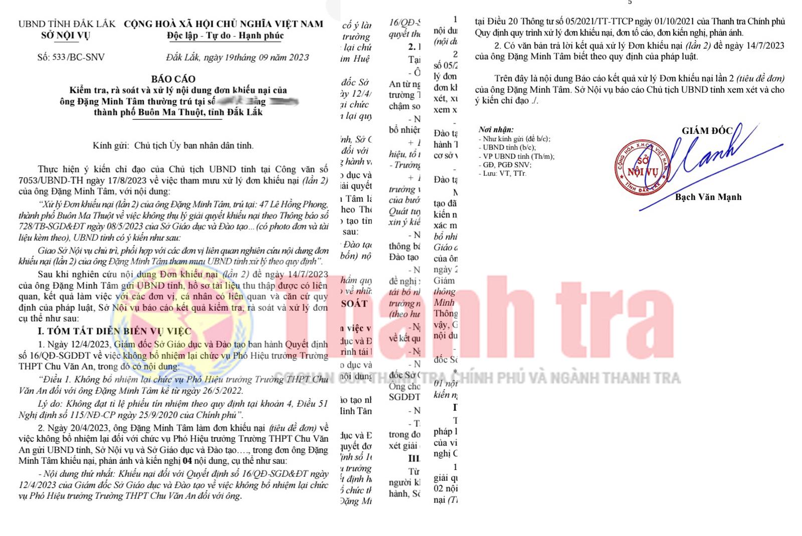 Báo cáo của Sở Nội vụ tỉnh Đắk Lắk nhận định: “Như vậy, Giám đốc Sở Giáo dục và Đào tạo chưa xem xét, xử lý và giải quyết đối với nội dung phản ánh nêu trong đơn ngày 20/4/2023”.