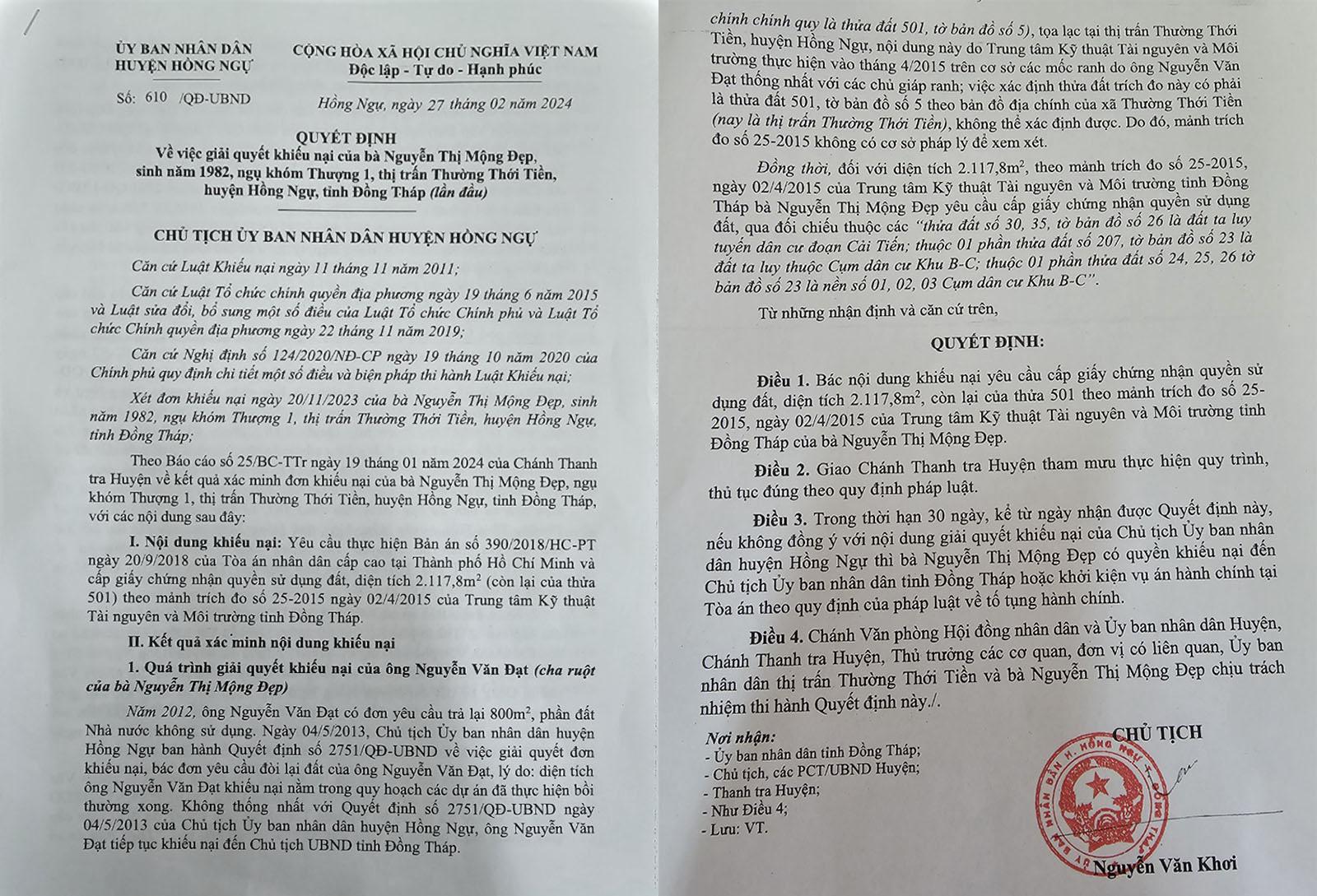 Ngày 27/2/2024, Chủ tịch UBND huyện Hồng Ngự đã ban hành Quyết định số 610/QĐ-UBND về việc giải quyết khiếu nại của bà Nguyễn Thị Mộng Đẹp. Theo đó, bác nội dung khiếu nại của bà Đẹp yêu cầu cấp giấy chứng nhận quyền sử dụng đất (GCNQSDĐ) diện tích 2.117,8m2, còn lại của thửa 501 theo Mảnh trích đo 25-2015 ngày 2/4/2015 của Trung tâm Kỹ thuật Tài nguyên và Môi trường tỉnh Đồng Tháp.