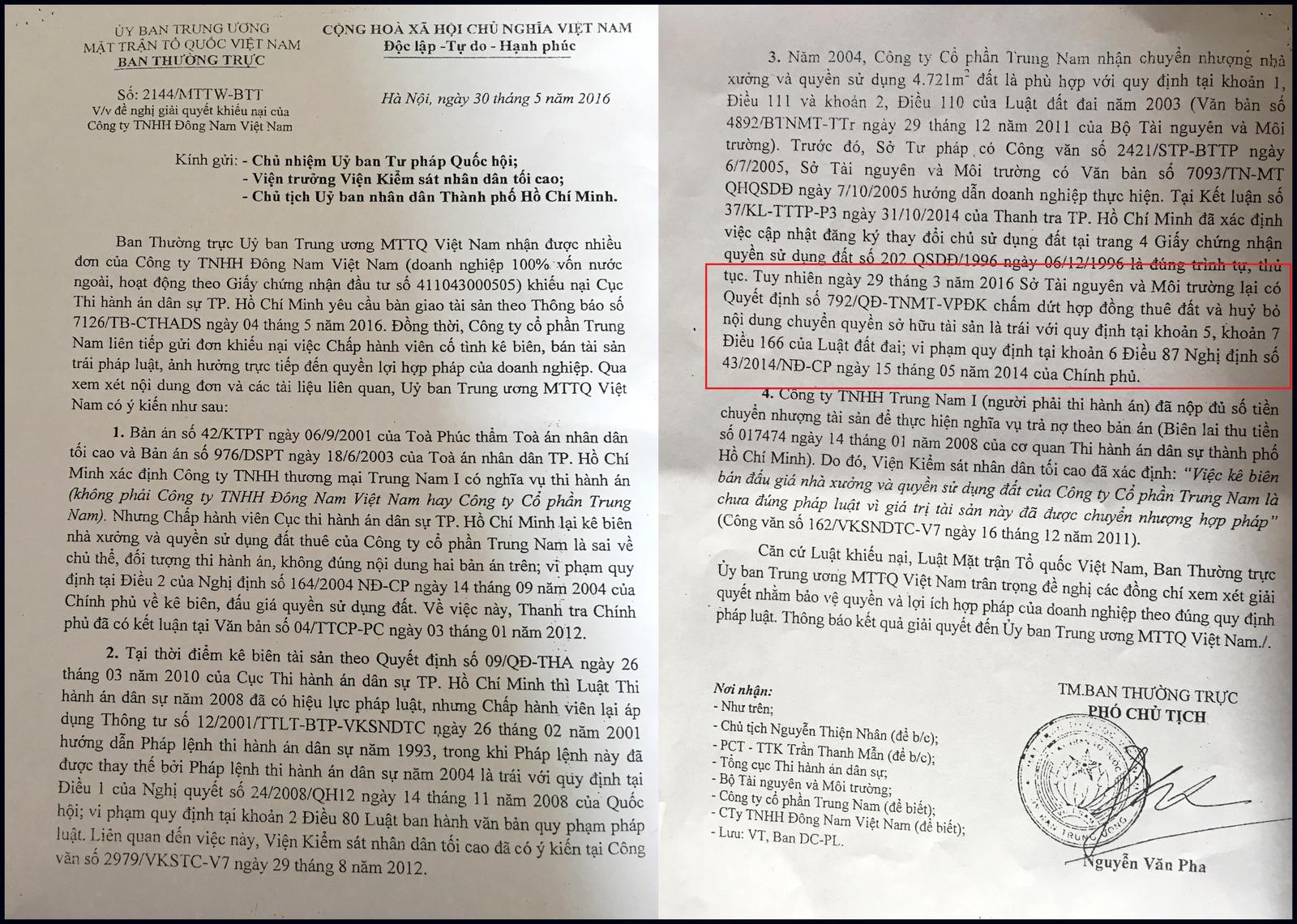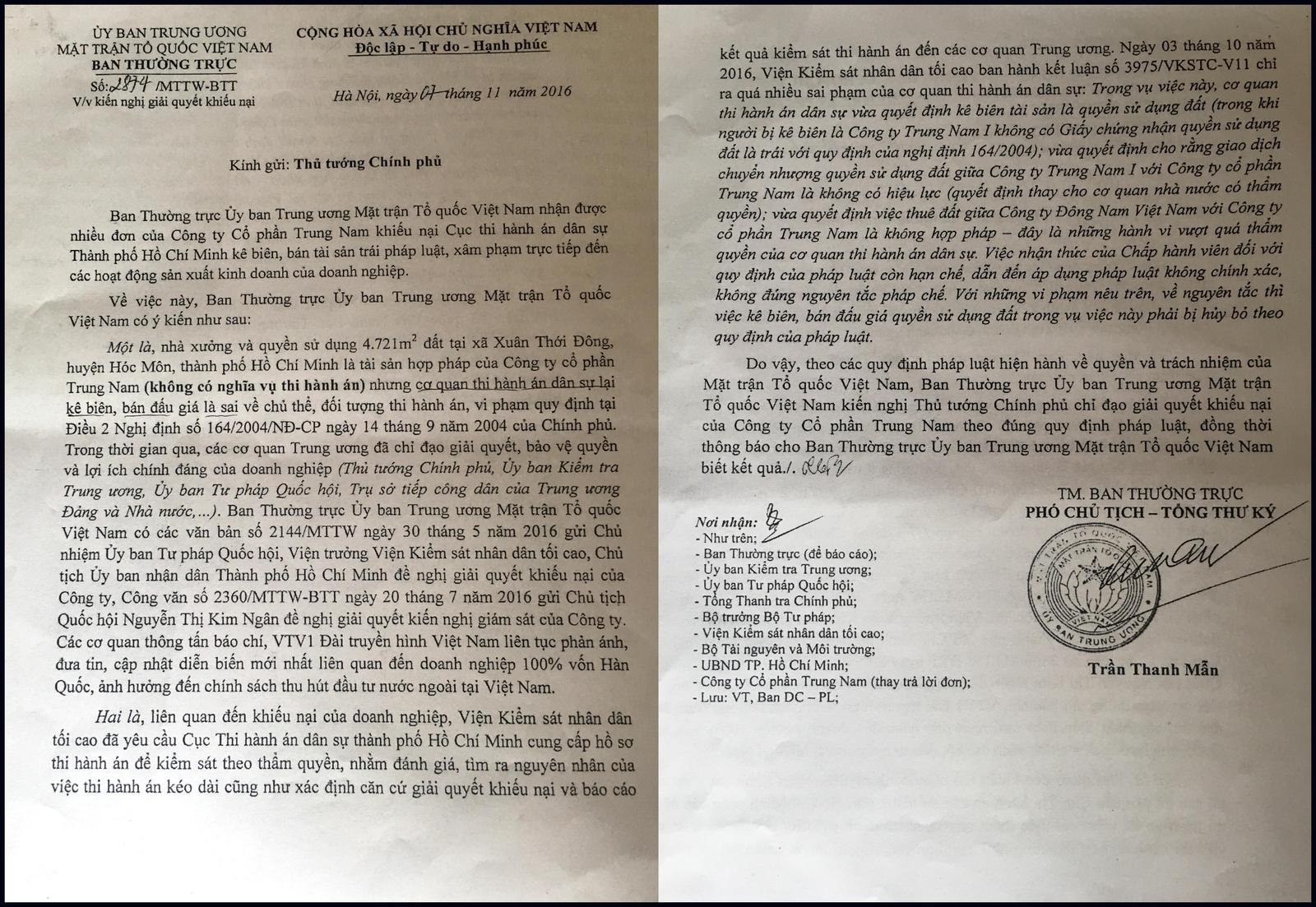Theo hồ sơ thu thập, liên quan tới việc kê biên, đấu giá tài sản là nhà xưởng và quyền sử dụng hơn 4.700m2 đất của Cty Trung Nam, từ năm 2013 đến nay, Ủy ban Trung ương MTTQ Việt Nam nhiều lần có công văn gửi các cơ quan từ UBND TP HCM tới Quốc hội và Chính phủ đề nghị giải quyết khiếu nại của hai doanh nghiệp là Cty Trung Nam và Công ty Đông Nam Việt Nam 100% vốn Hàn Quốc (Cty Đông Nam - đơn vị thuê nhà xưởng của Cty Trung Nam).