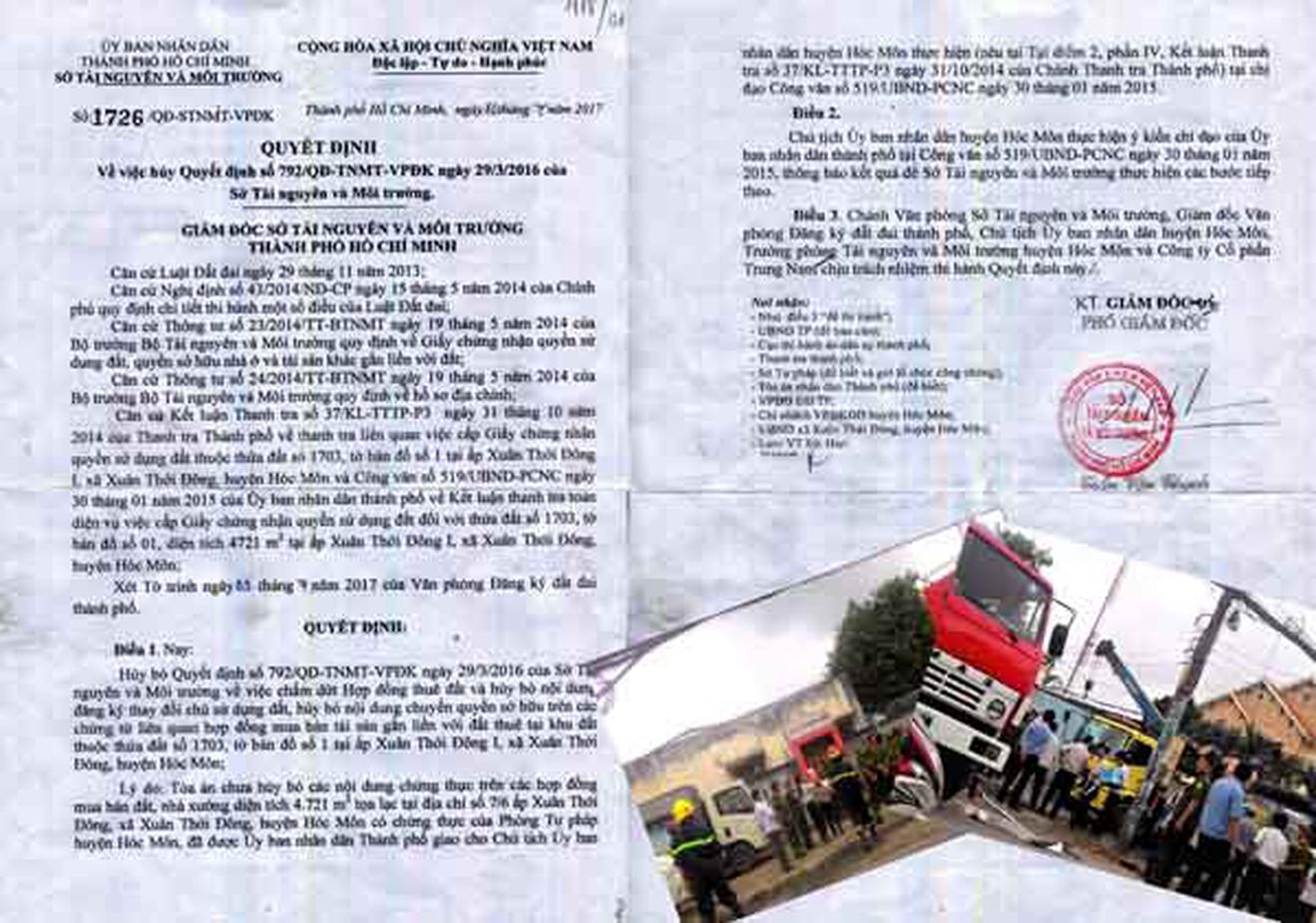 Ngày 10/7/2017, Sở TN&MT TP đã ban hành Quyết định số 1726/QĐ-STNMT-VPĐK để hủy bỏ Quyết định “trái luật” số 792/QĐ-TNMT-VPĐK. Theo đó, lý do được đưa ra là: “Tòa án chưa hủy bỏ các nội dung chứng thực trên các hợp đồng mua bán đất, nhà xưởng diện tích hơn 4.700m2 tọa lạc tại xã Xuân Thới Đông, huyện Hóc Môn có chứng thực của Phòng Tư pháp huyện, đã được UBND TP giao cho Chủ tịch UBND huyện Hóc Môn thực hiện tại chỉ đạo Công văn số 519/UBND-PCNC ngày 30/1/2015.