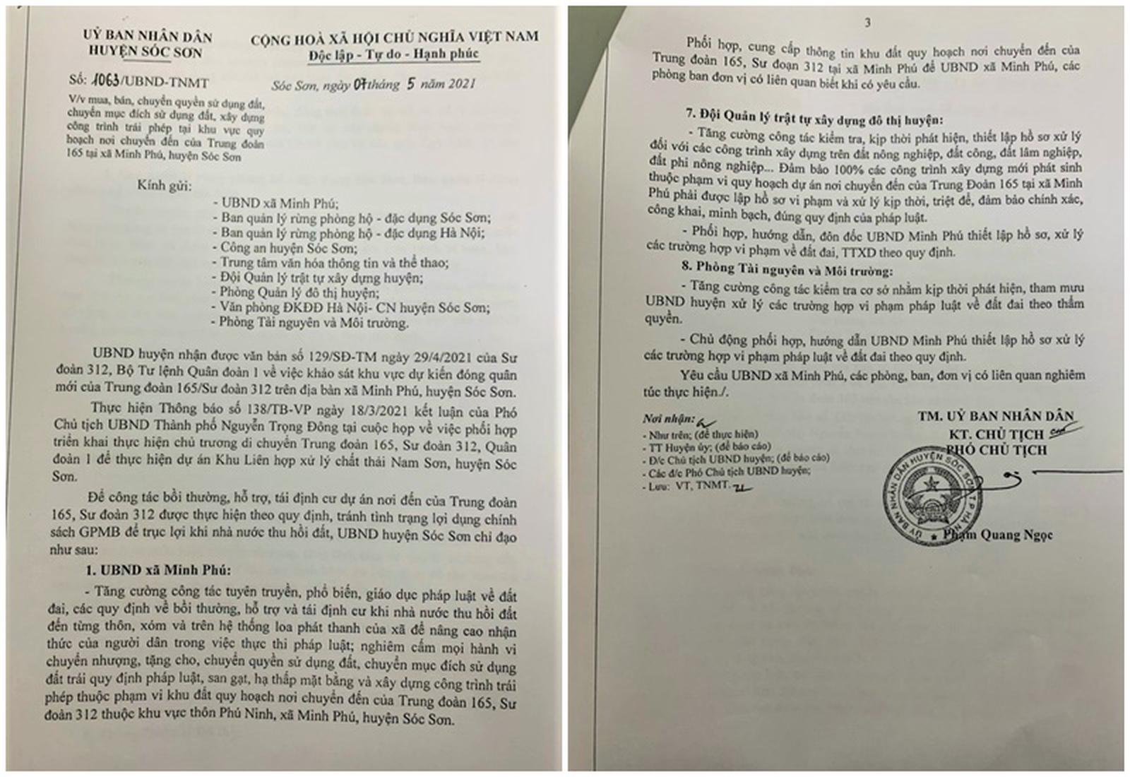 Ngày 7/5/2021, UBND huyện Sóc Sơn đã ban hành Văn bản số 1063/UBND-TNMT về việc nghiêm cấm mọi hành vi chuyển nhượng, tặng cho, chuyển quyền sử dụng đất, chuyển mục đích sử dụng đất trái quy định, san gạt, hạ thấp mặt bằng và xây dựng công trình trái phép thuộc phạm vi đất quy hoạch nơi chuyển đến của Trung đoàn 165, Sư đoàn 312 thuộc khu vực thôn Phú Ninh, xã Minh Phú.