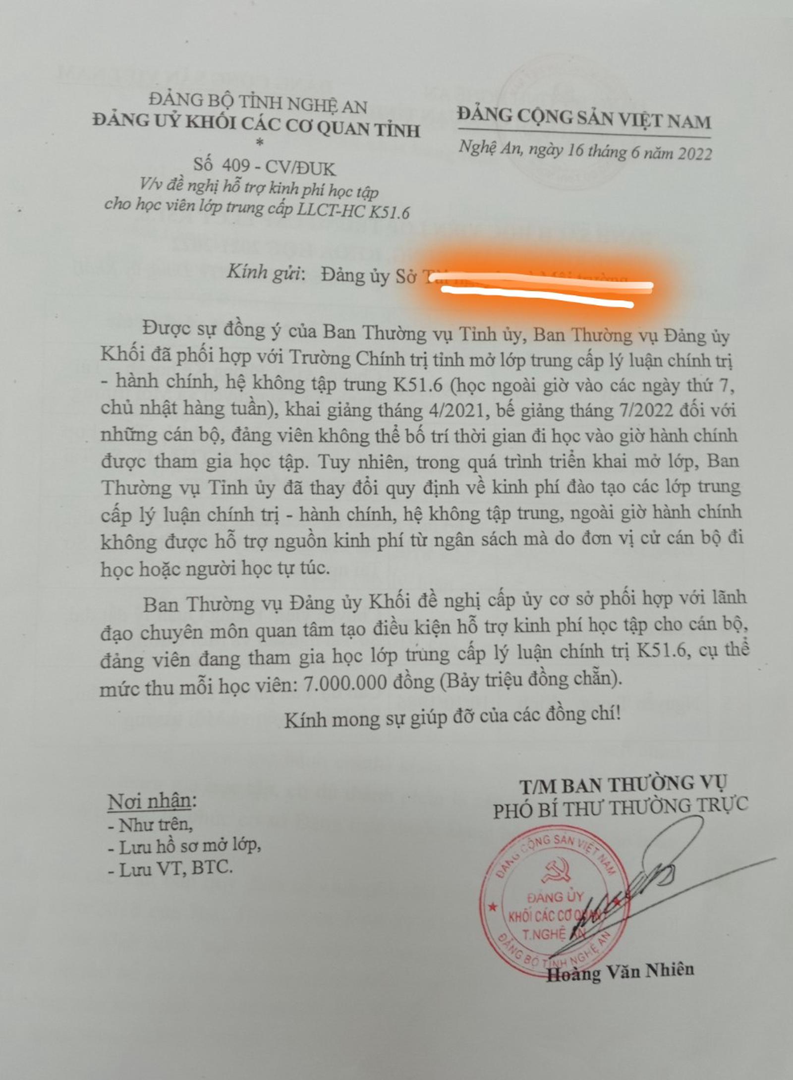 “Trước kia đã có lớp học được hưởng từ ngân sách, học viên không phải đóng học phí nhưng đối với lớp học này thì không có quy định như vậy. Các văn bản Đảng ủy Khối phát hành đều không đề cập đến học phí người học mà chỉ thực hiện theo Văn bản 3286 của Tỉnh ủy. Việc đài thọ kinh phí đào tạo thì trước kia Đảng ủy Khối cũng muốn tìm kiếm các nguồn kinh phí cho học viên vì họ là đối tượng vừa đi làm vừa đi học nên muốn hỗ trợ học viên nhưng đối chiếu các quy định của tỉnh đều không có nên ngày 16/6/2022, Đảng ủy Khối có công văn gửi các tổ chức Đảng có đảng viên đi học, trong đó có nêu đề nghị các cơ quan hỗ trợ 7.000.000 đồng/học viên theo thông báo cúa Trường Chính trị tỉnh về mức thu phí đào tạo, bồi dưỡng cán bộ. Riêng lớp lý luận chính trị - hành chính học ngoài giờ hành chính vào thứ 7, chủ nhật này là 7.000.000 đồng/học viên/khóa học”.