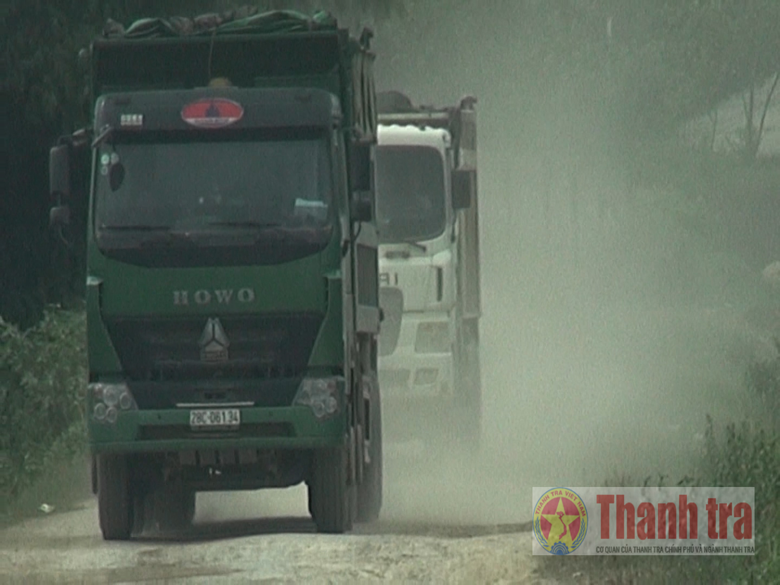 Đoàn xe chở đất chạy tung bụi trên đường gây ảnh hưởng đến đời sống của nhân dân. Ảnh: Hoàng Long